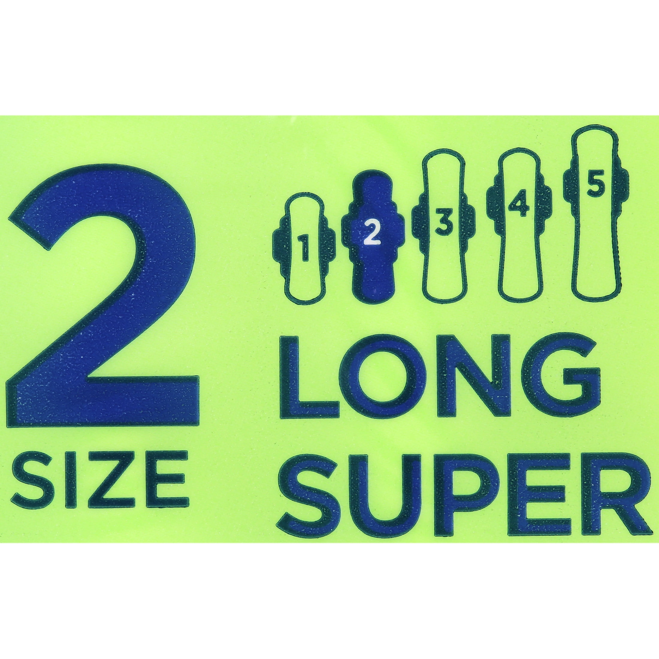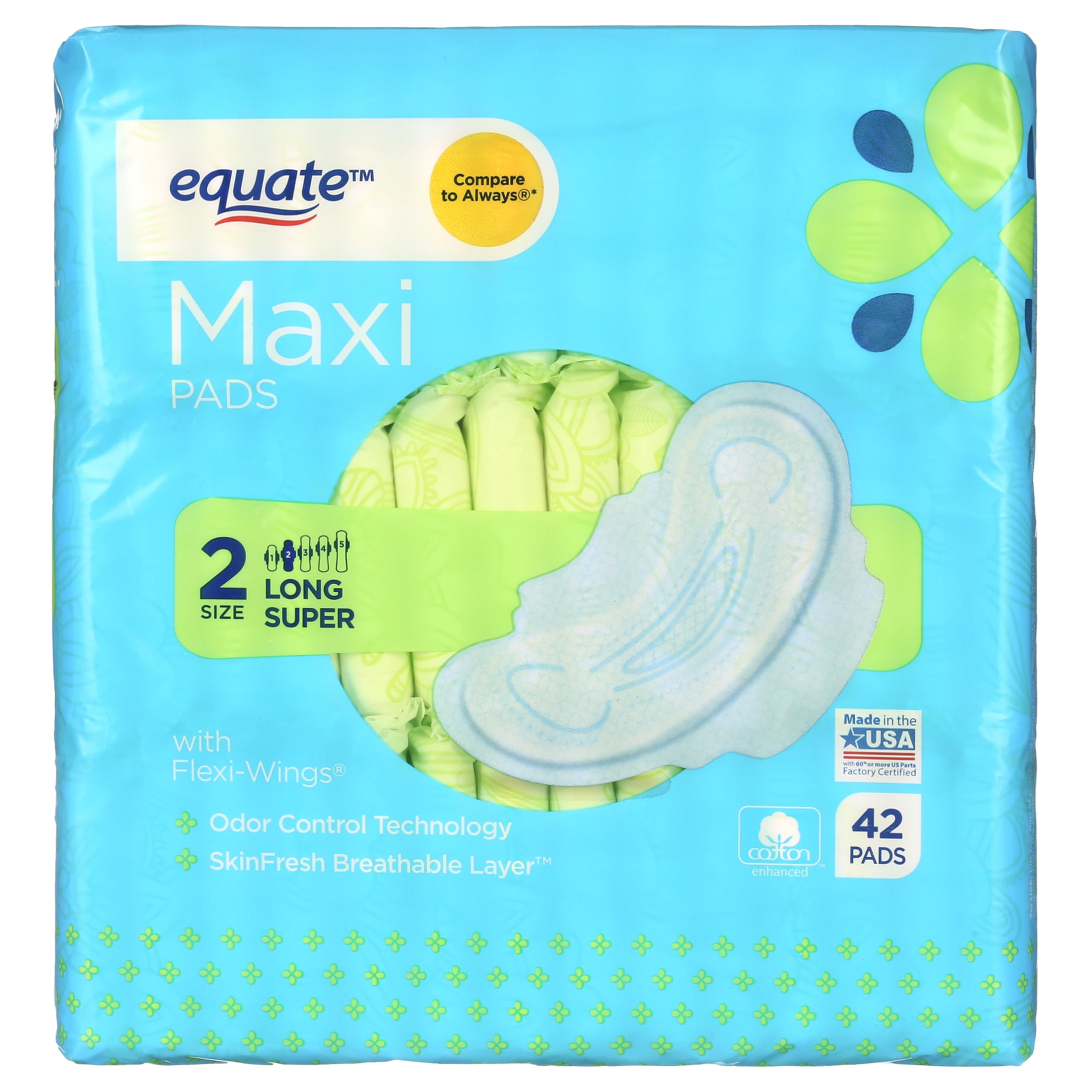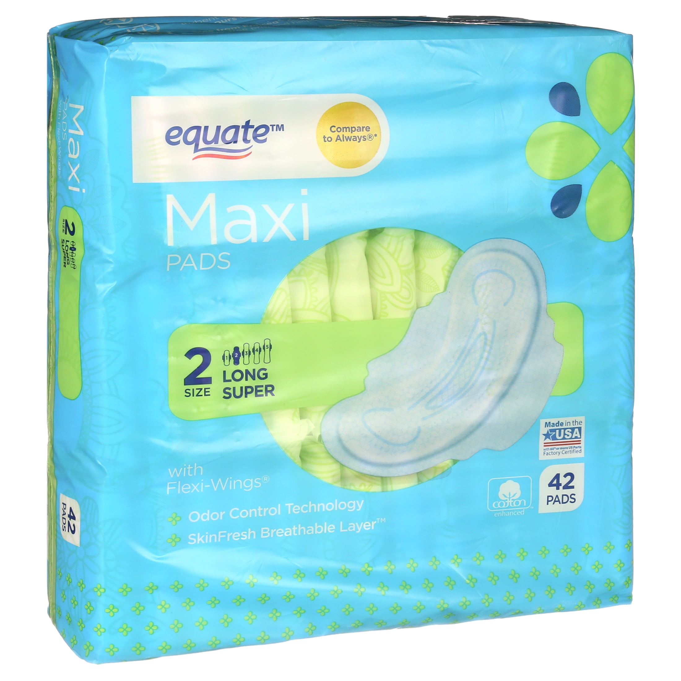 - Stop leaks from ruining your day with Equate Long Super Maxi Pads with Flexi-Wings, Size 2. Our pads offer three layers of protection to eliminate wetness, protect your skin, and eliminate unpleasant odor. Our cotton enhanced trade, cover wicks away moisture and maintains your skin’s health. The super-absorbent core locks away wetness for up to 8 hours of protection from leaks, and the Skin Fresh Breathable Layer trade, lets perspiration out to help keep you dry. These pads are also free from fragrances and elemental chlorine to offer you worry-free protection that keeps you confident and safe. Say goodbye to leaks and hello to peace of mind with Equate Long Super Maxi Pads with Flexi-Wings, Size 2