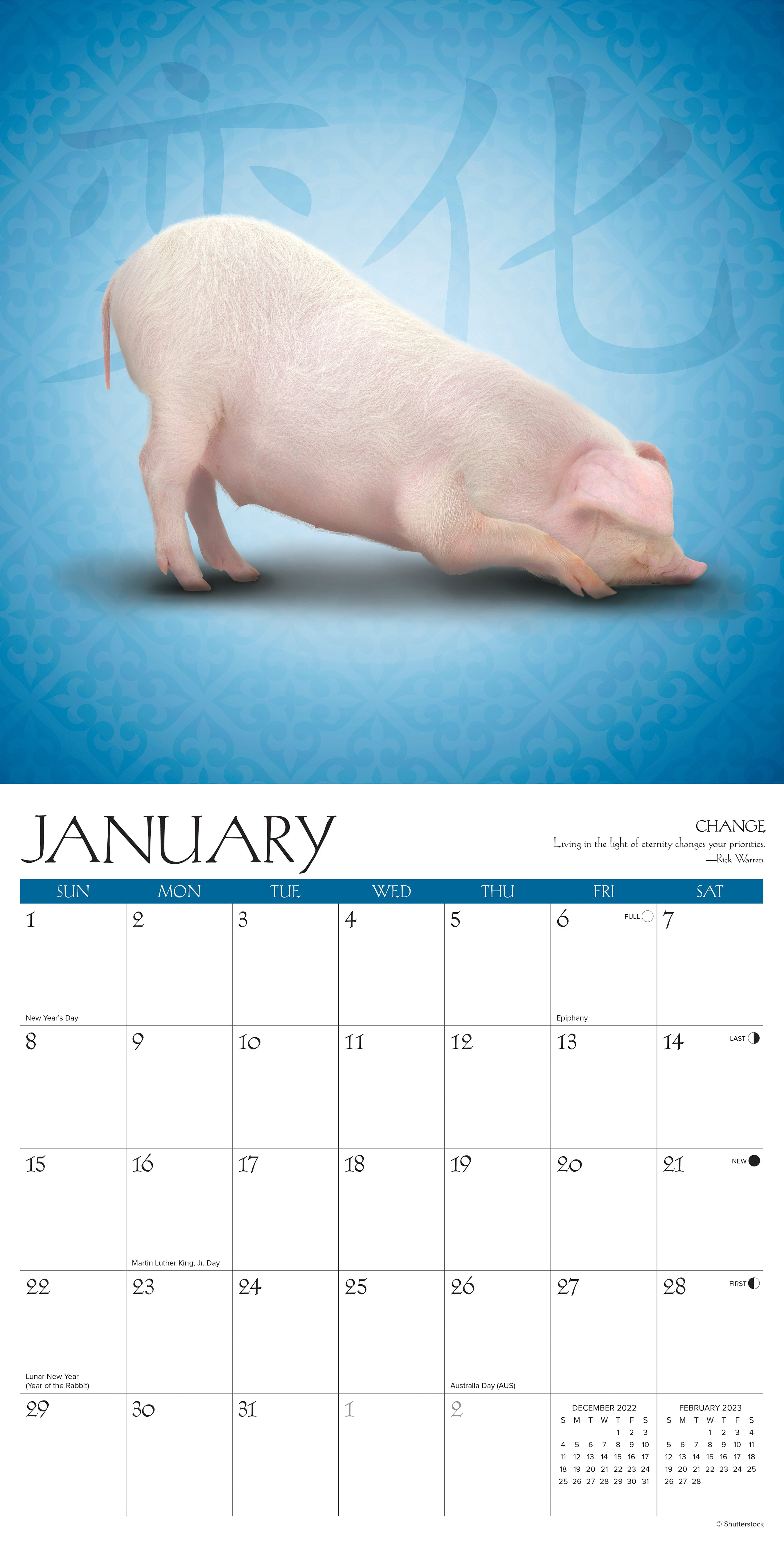 The success of the best-selling Cow Yoga calendar was not lost on the other farm animals. Now the pigs, chickens, sheep and nearly all the critters in the barnyard are getting into the act with myriad poses and postures that you would deem impossible if you were not witnessing them with your own eyes! Printed with soy-based inks on FSC certified paper, this 12" x 12" wall calendar features large monthly grids that offer ample room for jotting notes, along with six bonus months of July through December of 2022. Also includes moon phases (CST), standard U.S. and international holidays.
