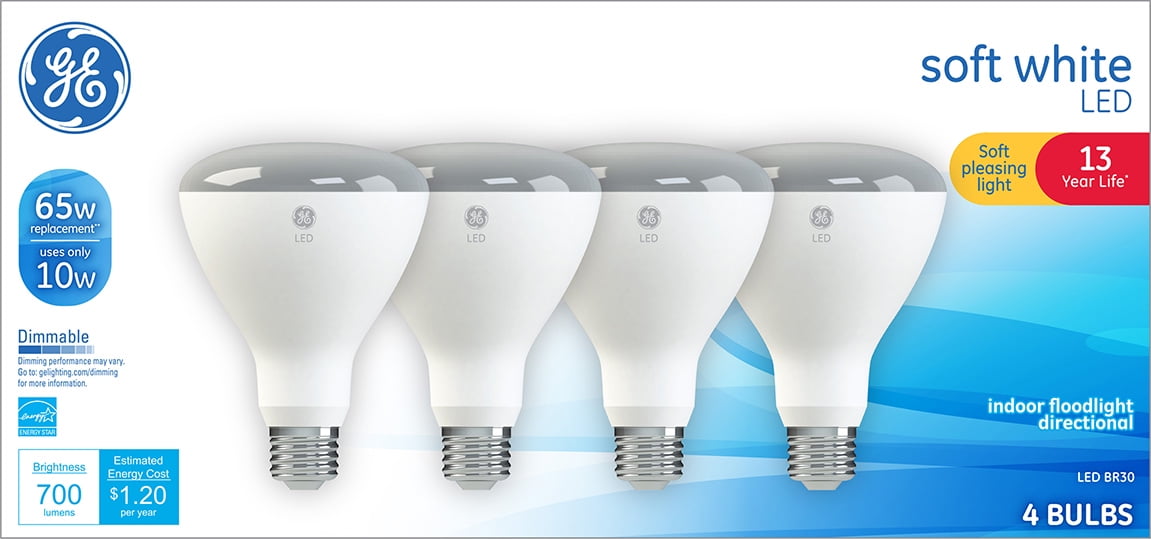 GE LED 10W (65W Equivalent) Soft White, BR30 Indoor Flood Light Bulbs, Medium Base, Dimmable, 4pk