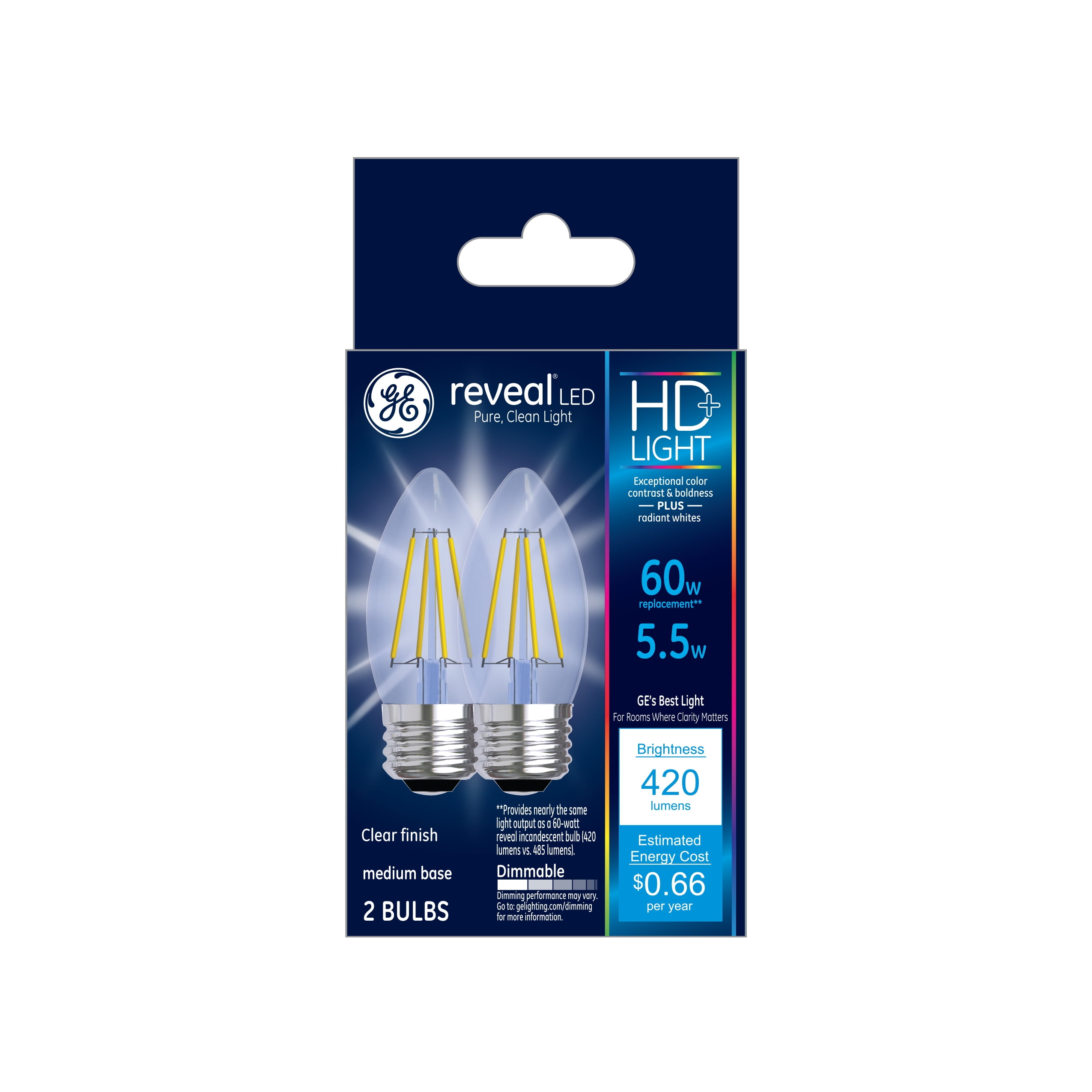 GE Reveal HD+ 5.5-Watt (60W Equivalent) LED Clear Decorative Light Bulbs, Medium Base, Dimmable, 2pk