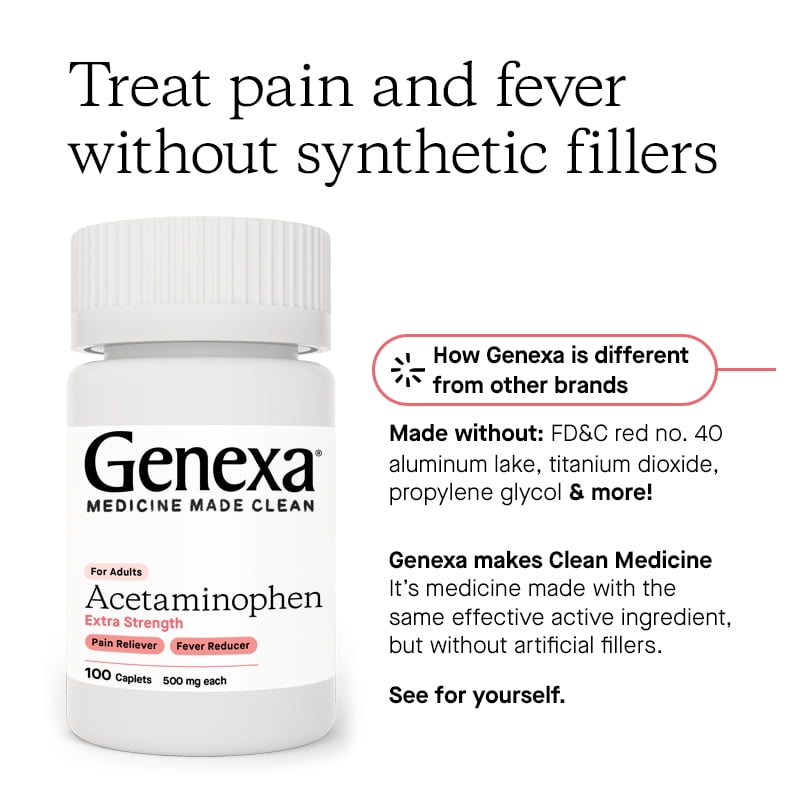 Genexa Extra Strength Acetaminophen Pain & Fever Relief Caplets is a pain relief medicine that temporarily relieves minor aches and pains and temporarily reduces fever. Each caplet contains 500 mg of acetaminophen to use for temporary relief of minor aches and pains due to headache, toothache, minor pains of arthritis, backache, the common cold, and premenstrual and menstrual cramps. These temporary pain relief caplets are formulated for use by adults as well as children 12 years and over. All Genexa products are free of artificial preservatives, artificial dyes, parabens, and common allergens. Founded by two dads who believe in putting People Over Everything®, Genexa makes medicine with the same active ingredients people need, but without the artificial ones they don’t. It’s real medicine, made clean.