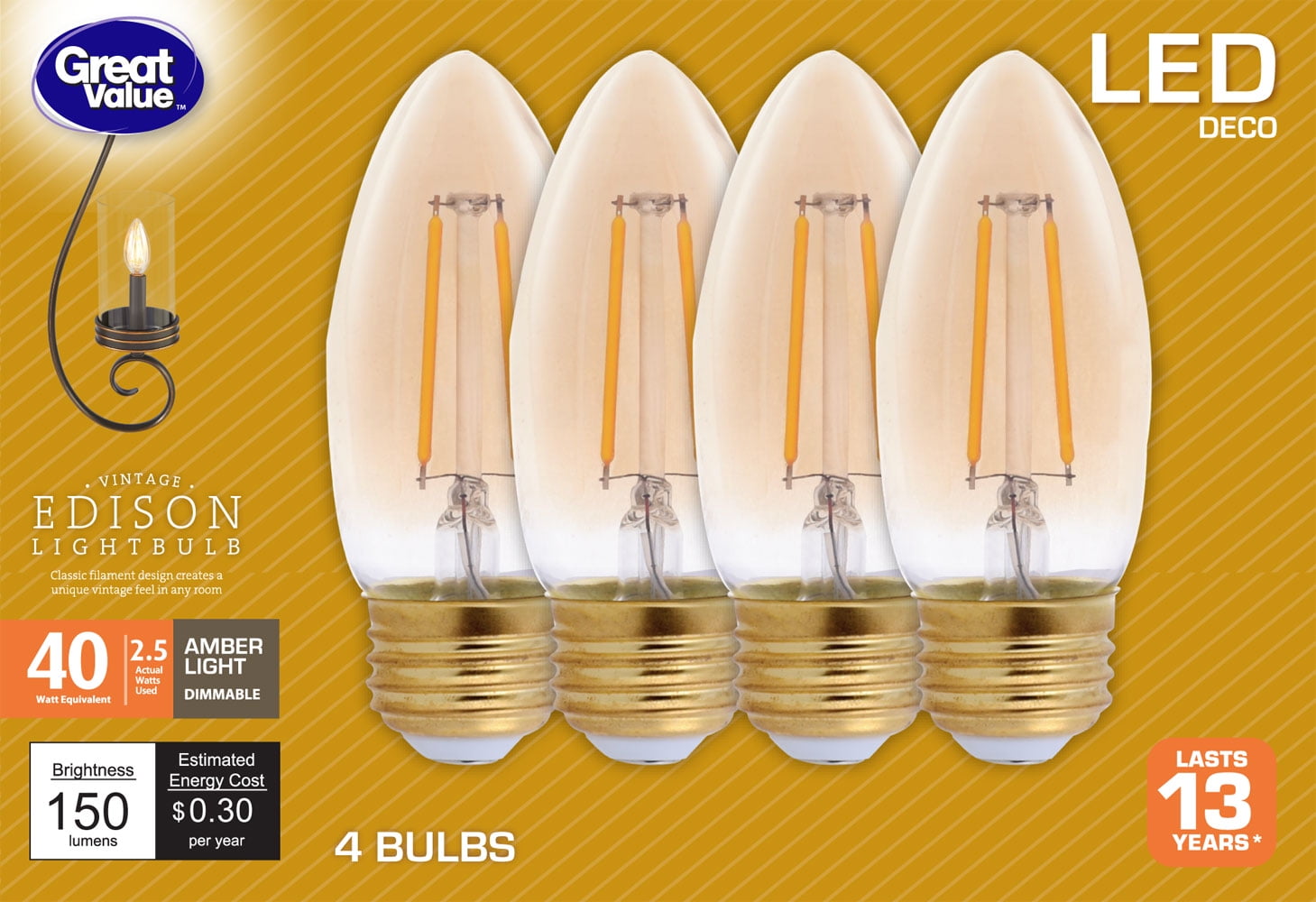 Great Value LED 2.5 Watts Deco Amber Light Medium Base Bulbs, 4 Count