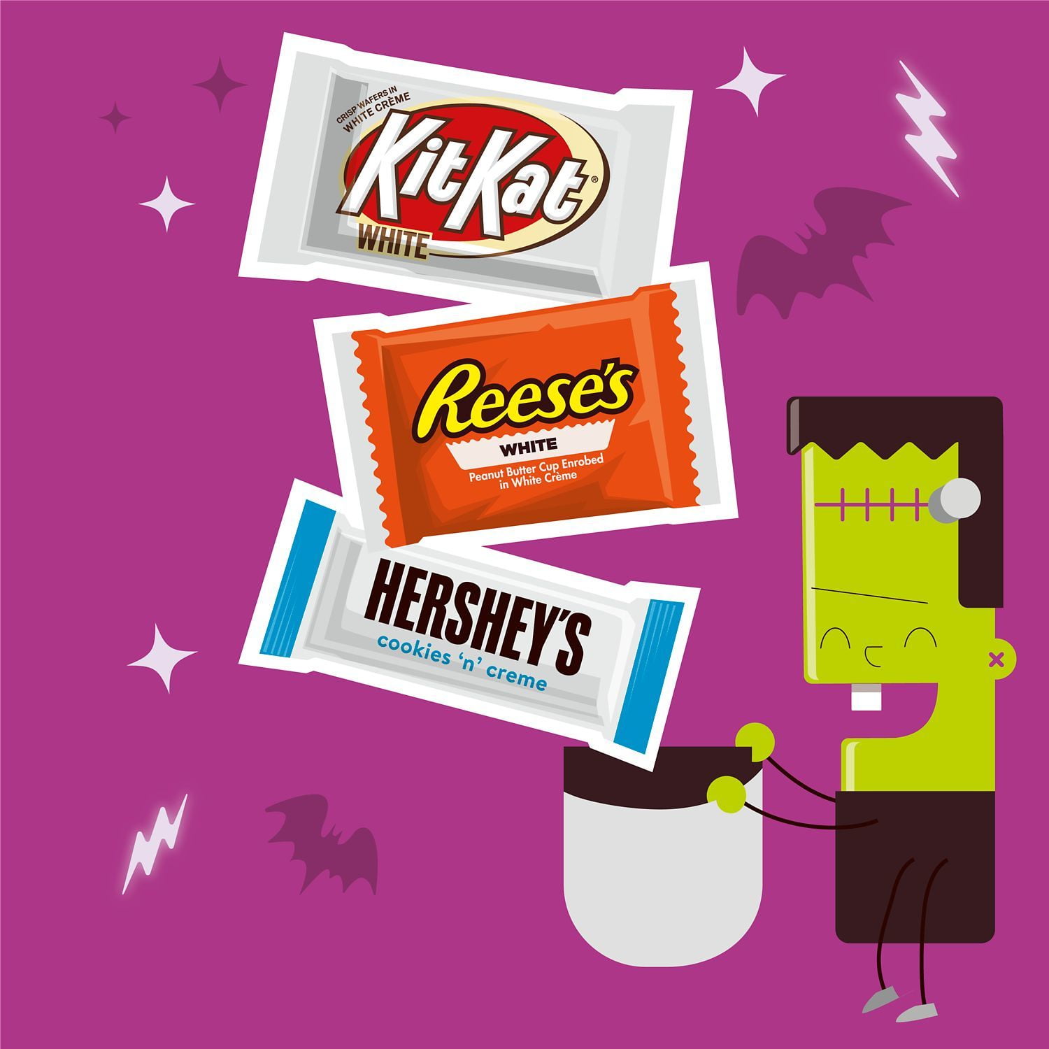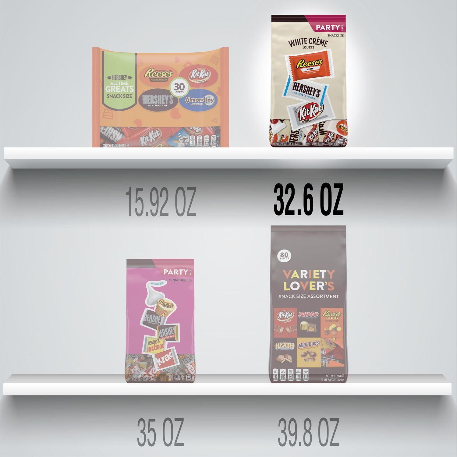 - Contains one (1) 32.6oz. party pack of REESE’S, HERSHEY’S and KIT KAT® Assorted White Crème Snack Size Candy with approximately 59 pieces