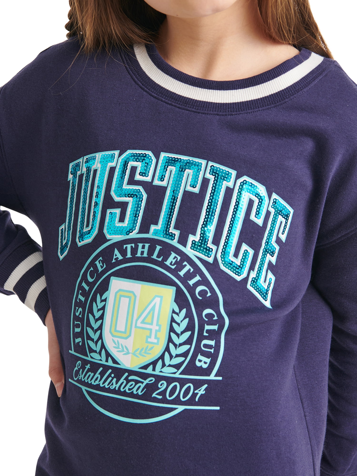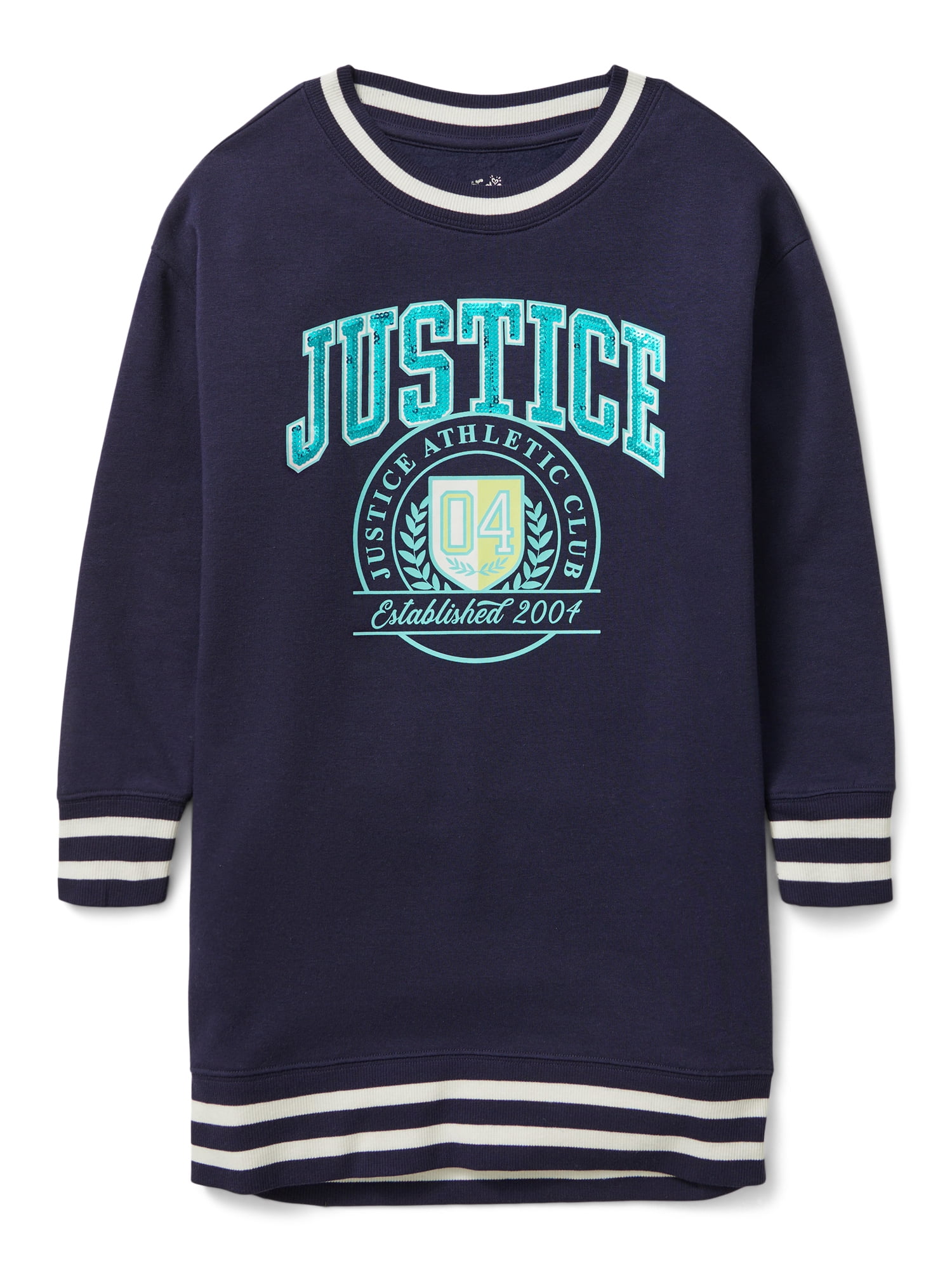 Your fashionista will feel amazing in the Justice Girls Rib Cuff Sweatshirt Dress. This cute dress features an academic-inspired graphic & sequin branding. Made from super cozy french terry fabric, this adorable dress will be a hit with your fashionista! Pair it with her favorite accessories for a look as unique as she is!