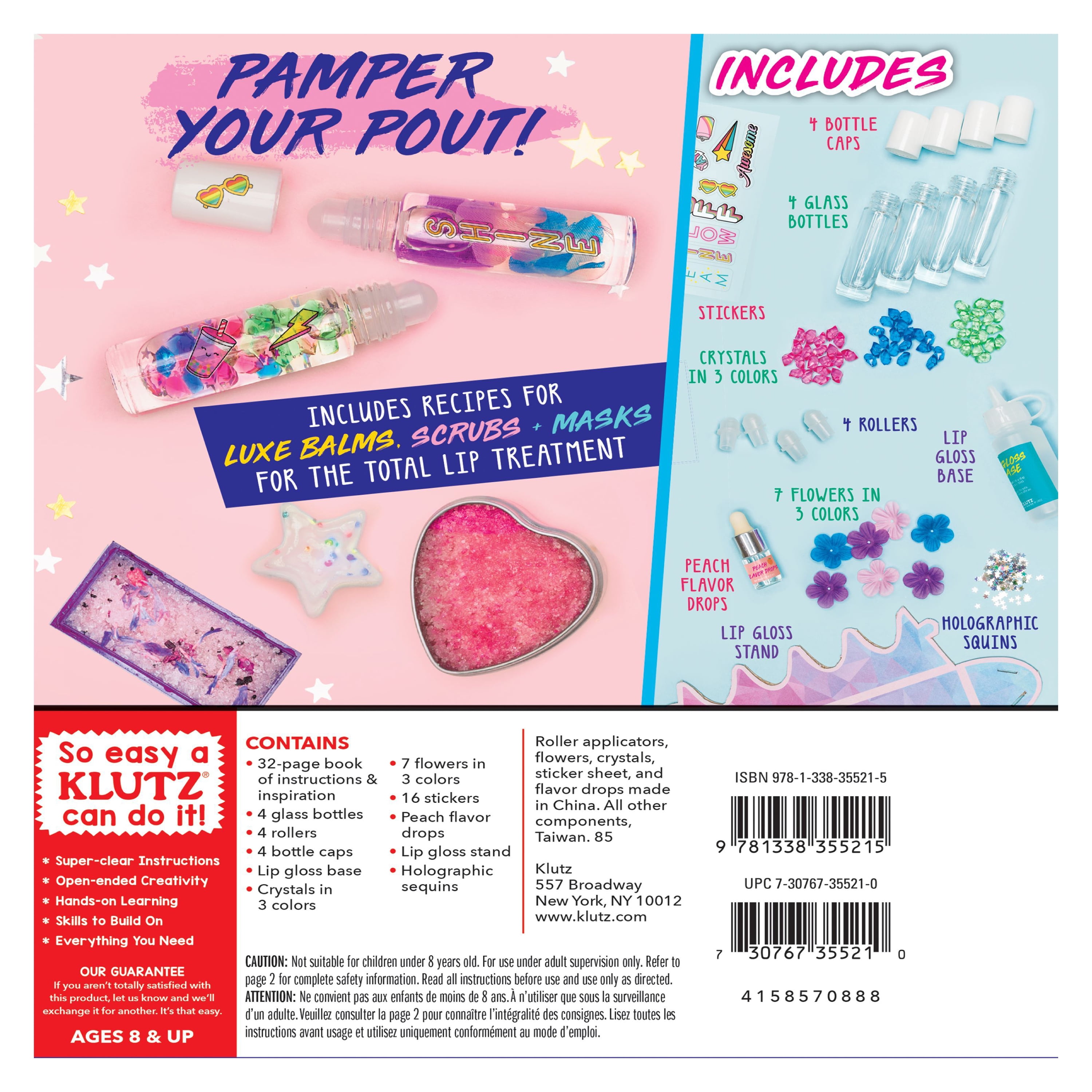 Colorful crystals, flowers, and glitter floating in clear lip gloss make this kit as fun to look at as it is to use. Start with personality quizzes to help you choose the perfect combo of gems, glitter, and flowers. Then add these to our unique formula of shiny gloss with soothing aloe and sweet peachy flavor. Your lips will shine with themes like Unicorn Vibes, Gem Powers, and Fun Florals. Then try one of the DIY lip care recipes in the book featuring easy-to-find ingredients like honey and sugar. Once you’re finished designing your 4 lip glosses, decorate with stickers and assemble the cute display case to show them off! Recommended ages 6 years and up. WARNING: CHOKING HAZARD — Small parts. Toy contains a small ball. Not for children under 3 yrs.