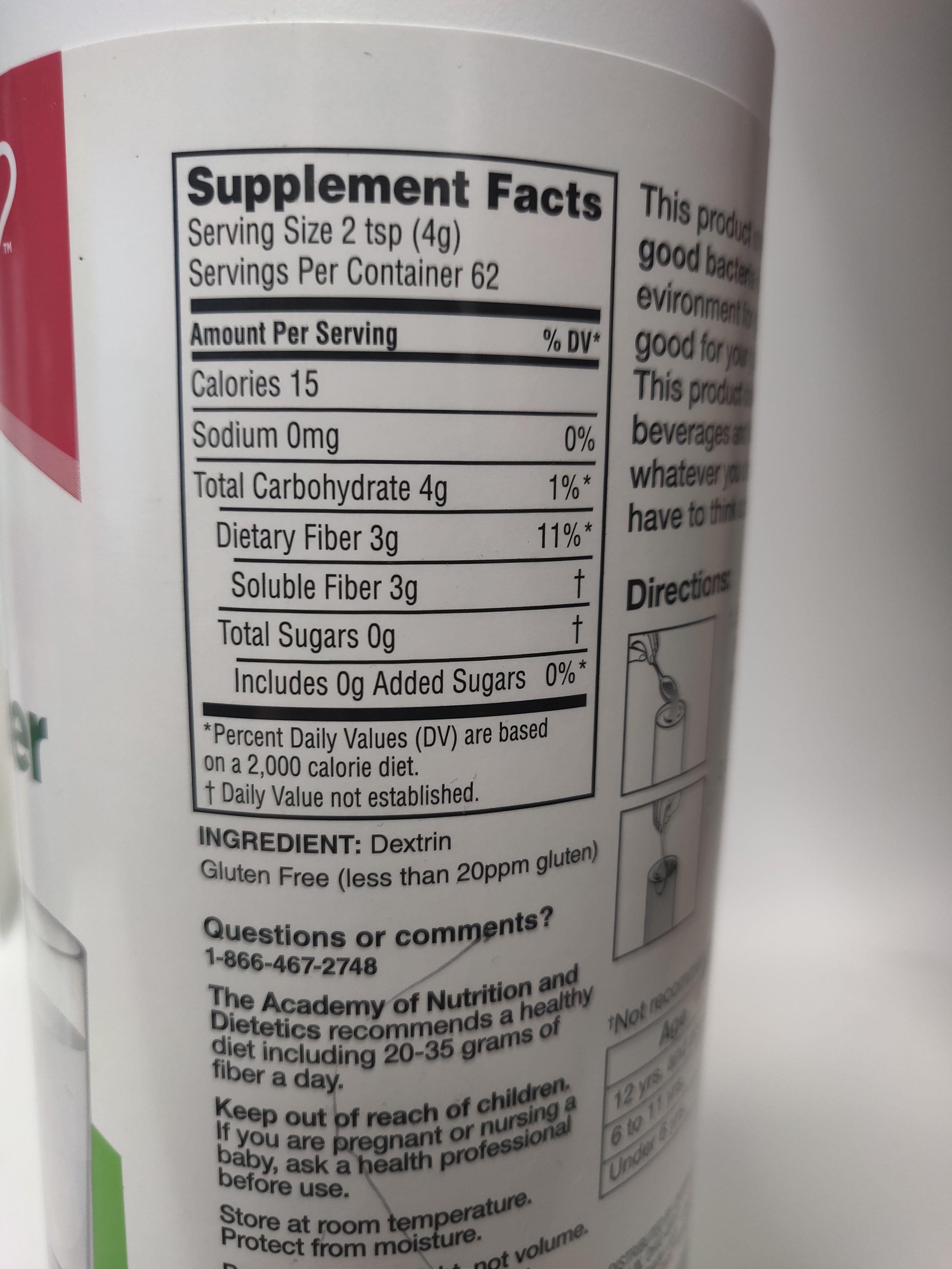 The Academy of Nutrition and Dietetics recommends a healthy diet including 20-35 grams of fiber a day. Keep out of reach of children. If you are pregnant or nursing a baby, ask a health professional before use. Store at room temperature, protect from moisture.