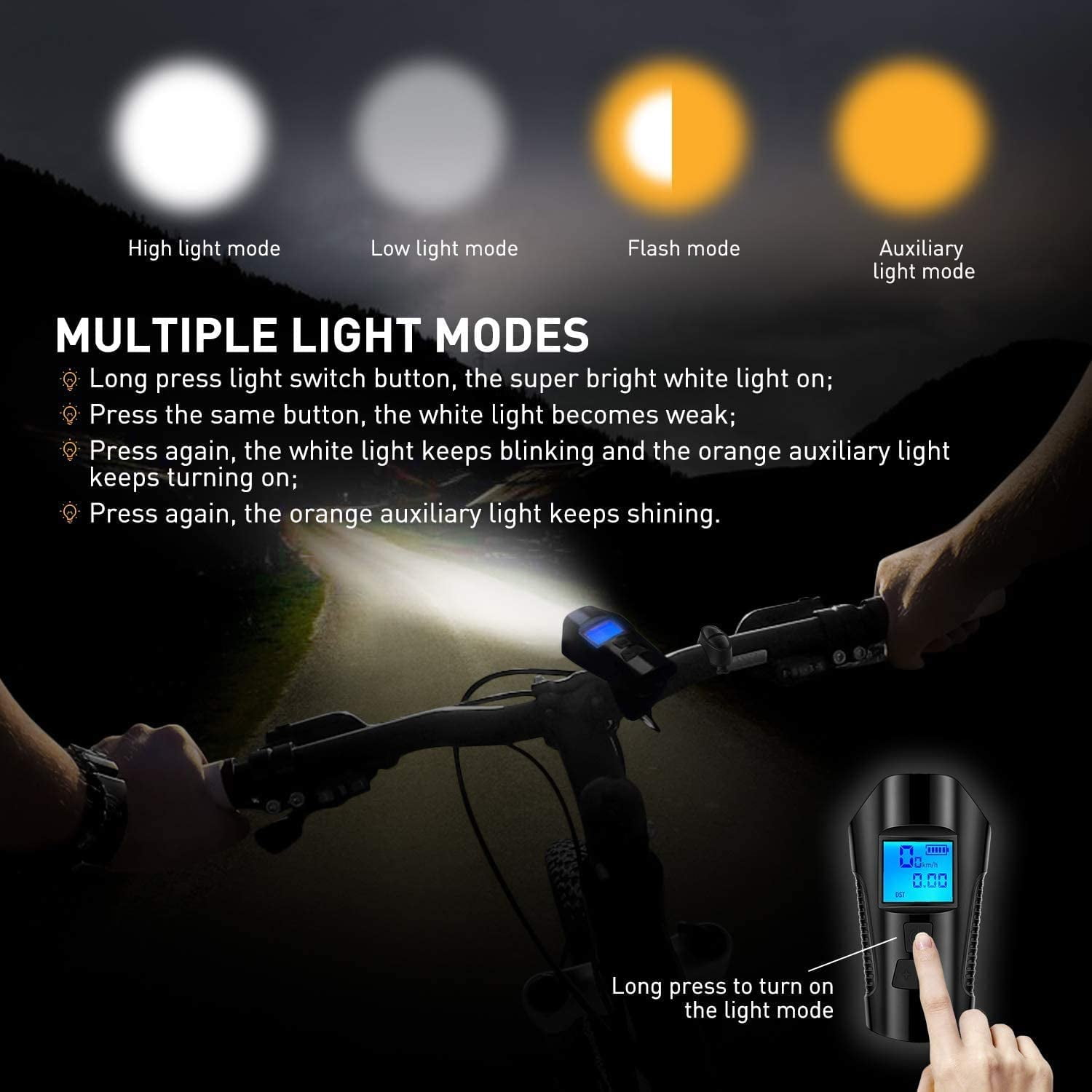 - 4. 4 lighting modes : Our Led bicycle lamp contains 4 light modes. Mode 1: The super bright white light is on. Mode 2: The white light becomes weak. Mode 3: The white light continues to flash and the orange auxiliary light continues to light up. Mode 4: The orange additional light continues to shine.