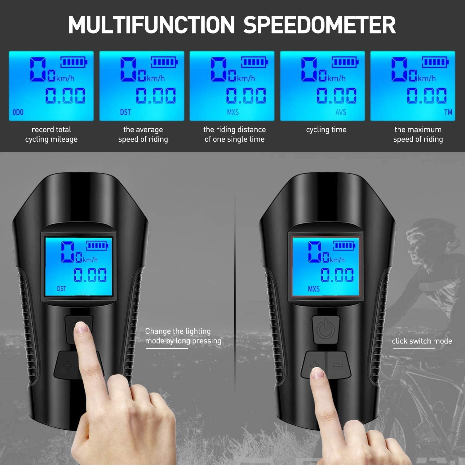 - 1. ALL IN ONE – functions : Our odometer bike light measures speed, distance and driving time.