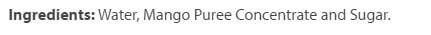 - 130 calories per 8 fl oz serving. Since 1947. Mango juice drink from concentrate. Pasteurized. Questions or comments? Call 1-877-342-1813. Please recycle. Made in Belgium.