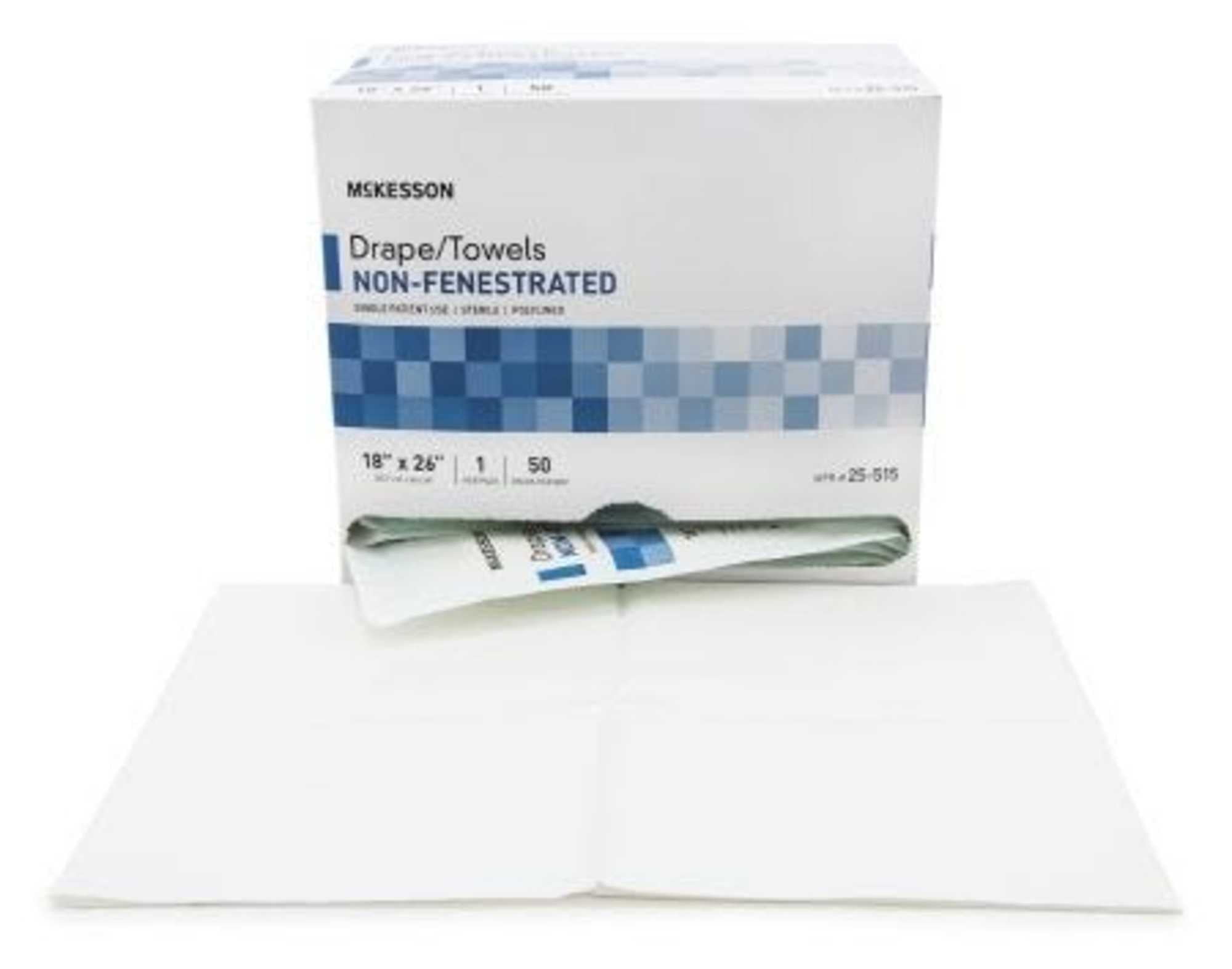 McKesson Field Drape/Towel Non-Fenestrated is poly-lined and sterile to be ready to be used in operating rooms. This important hospital supply product is applied during surgical procedures to drape over the body to isolate the surgical field. The inner poly layer repels moisture to prevent bacterial strike-through.General Purpose Sterile Field Drapes (McKesson 25-515) are available individually, a box of 50, and a case of 300. Each field drape is white with a single drape in each package to preserve sterility.