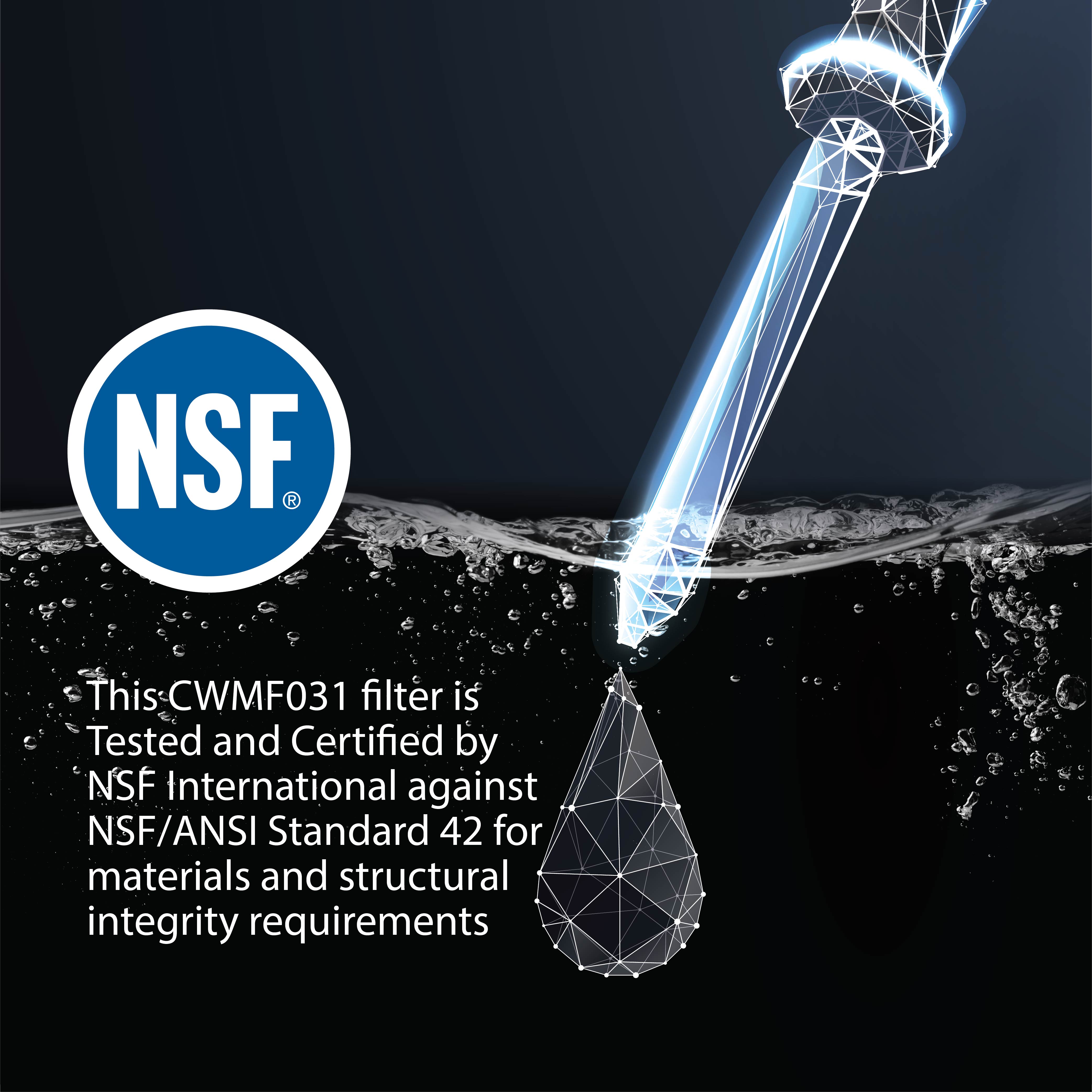 - Tested and certified by NSF International to NSF/ANSI Standard 42. Reduces chlorine, taste and odor to deliver pure clean and refreshing water.