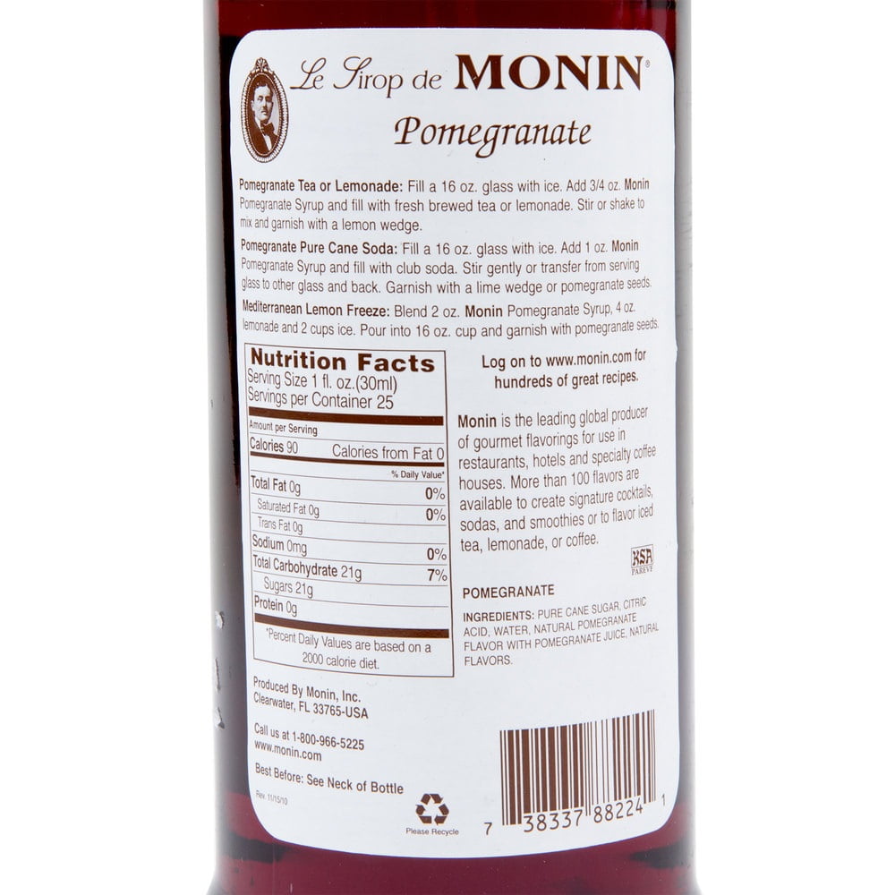 Monin Pomegranate Syrup adds a tart, robust flavor to almost any beverage. Crafted with select ingredients and pure cane sugar in a highly concentrated, authentic flavoring offering exceptional versatility. Infuse flavor in cocktails, mocktails, iced teas, Italian sodas, margartias, sangrias and more. Monin products are gluten free, alcohol free, and GMO free. All Monin products are Kosher certified. Does not contain high fructose corn syrup.Aroma is reminiscent of berries and grape, flavor is distinctively tart and sweet