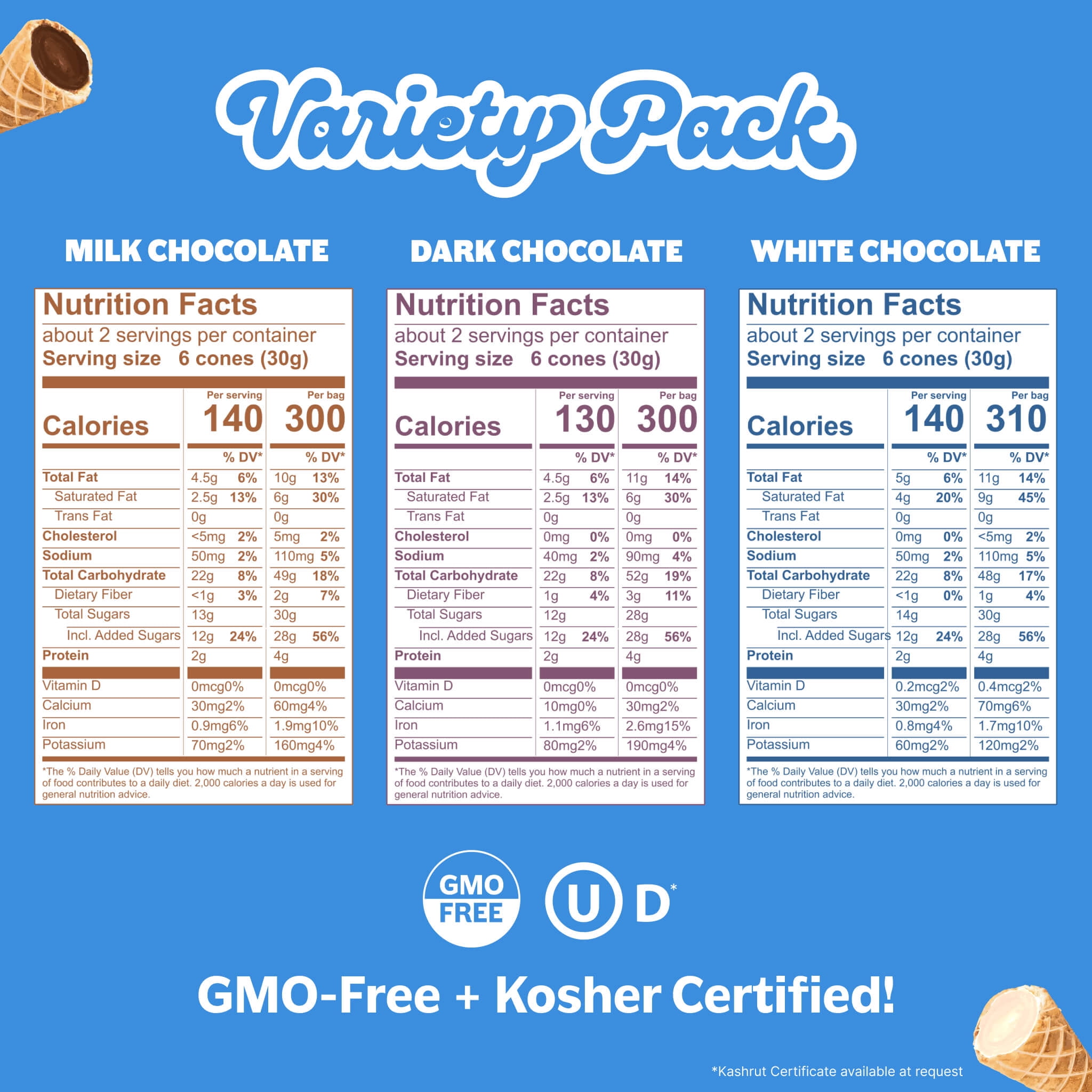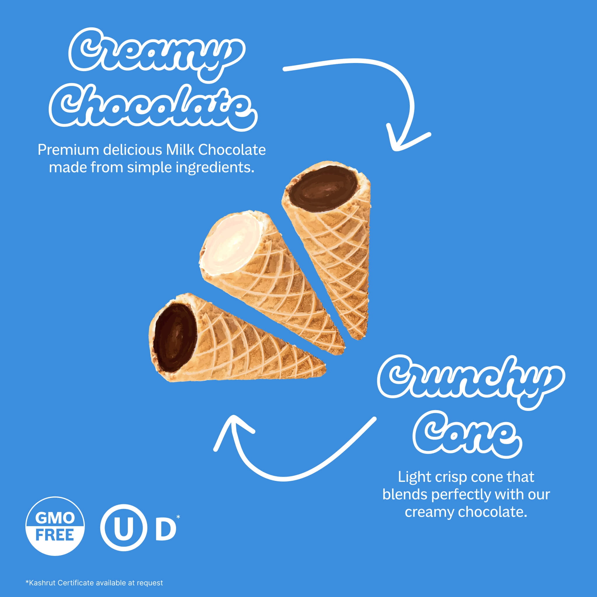 - The best bite over and over again! Light, crunchy, mini waffle cones with smooth, rich milk chocolate. A snack that can be paired with anything at any time. Each bite will give you that familiar sense of happiness as if you were just finishing a sundae cone.