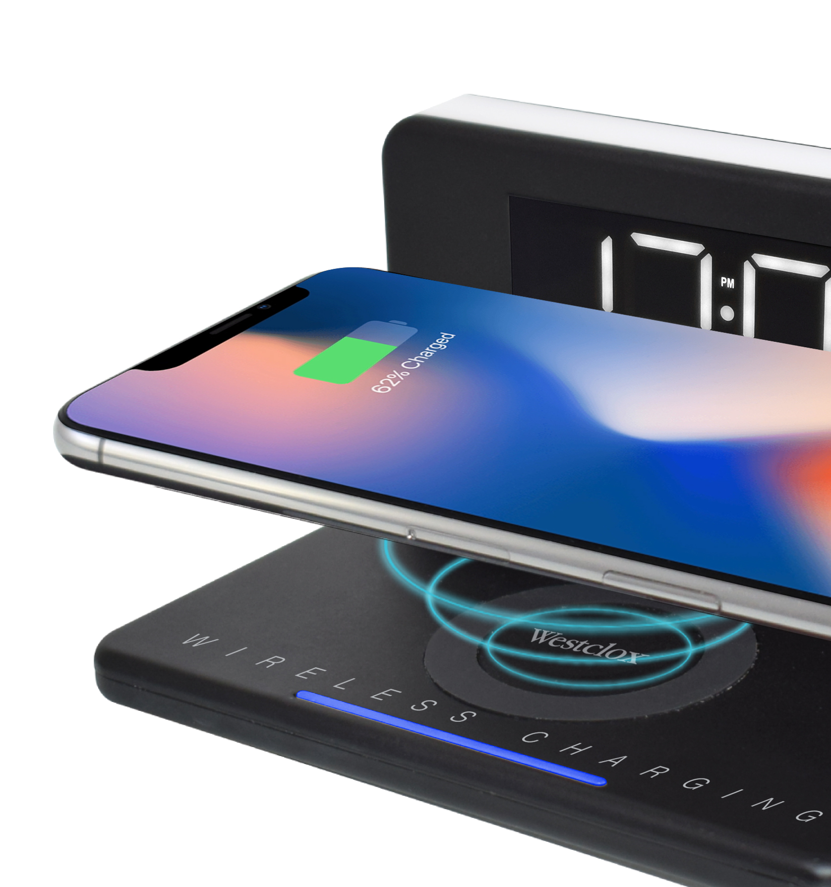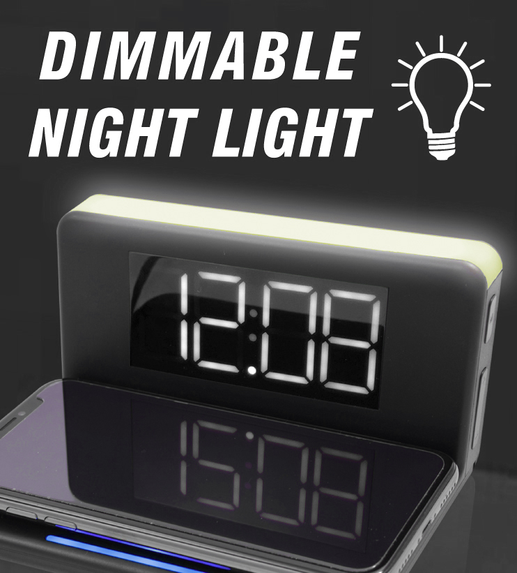 The Westclox Compact Black Alarm Clock with Qi Wireless Charging a LED Night Light and USB Charging Port is a must have. It has a Alarm Clock with 5 Minute Snooze, You can charge your devices through the built in QI Wireless Charging Pad or USB Port, The display brightness automatically and dims between Midnight and 7am not to disturb your sleep, This also has a Night Light with 3 different levels of Brightness.
