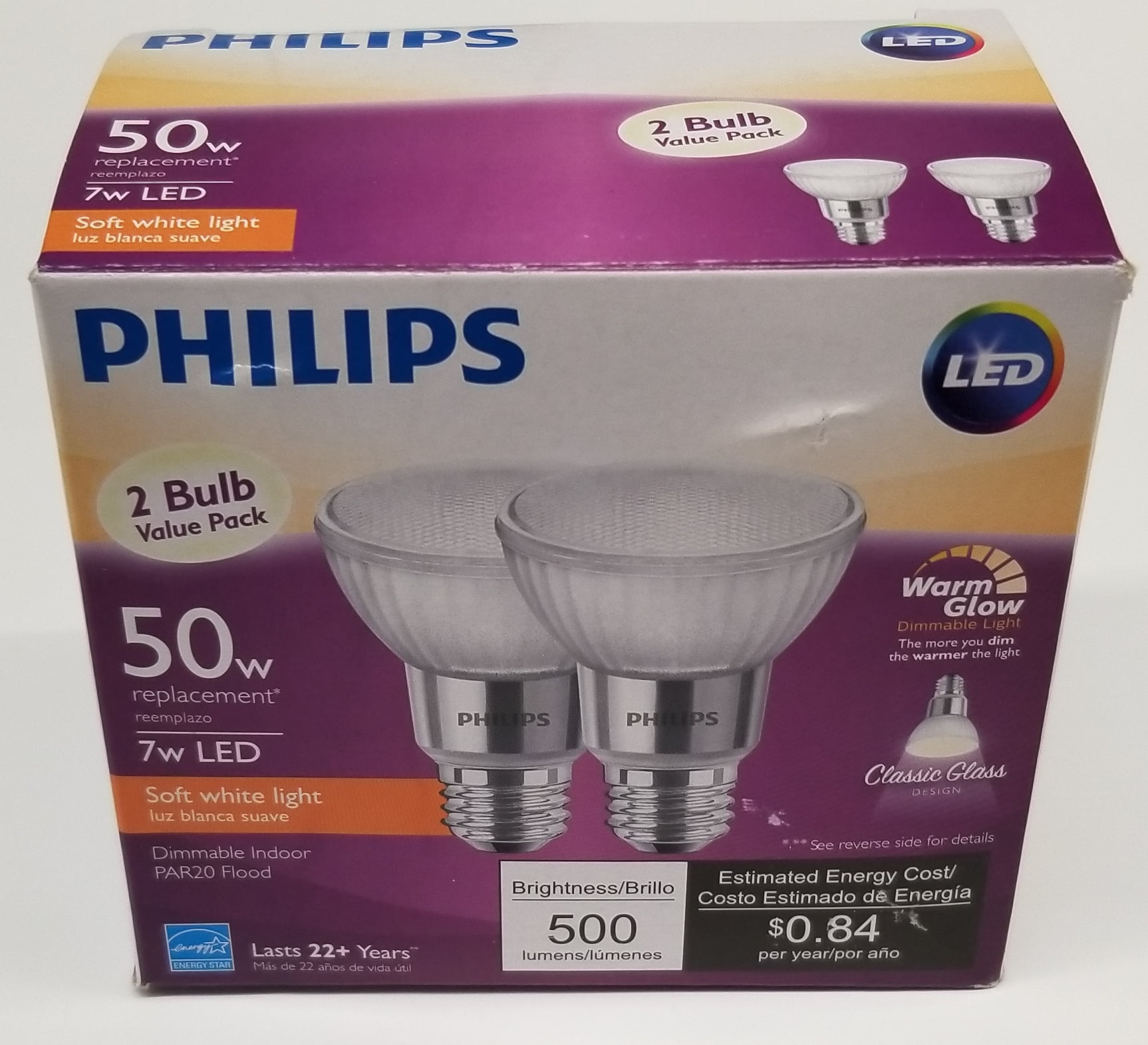 Philips energy saving PAR20 Medium LED (light emitting diode), 40-degree spotlight Floodlight Glass Light Bulbs provide 500 lumens of soft white, dimmable light, equivalent to 50-watt incandescent with 80% less energy use. PAR20 is an energy saving alternative to standard incandescent bulb with a classic glass design. Ideal for use in recessed and track light fixtures. Provides a wide beam of white light for general purpose lighting. California Title 20 compliant. Delivers high CRI (color rendering index) for showing colors naturally and vividly. Philips LED dimming is flicker-free, silent, and tested to work with more dimmer switches than any other LED on the market. PAR20 Philips LEDs are expected to deliver a lifetime of over 22 years.