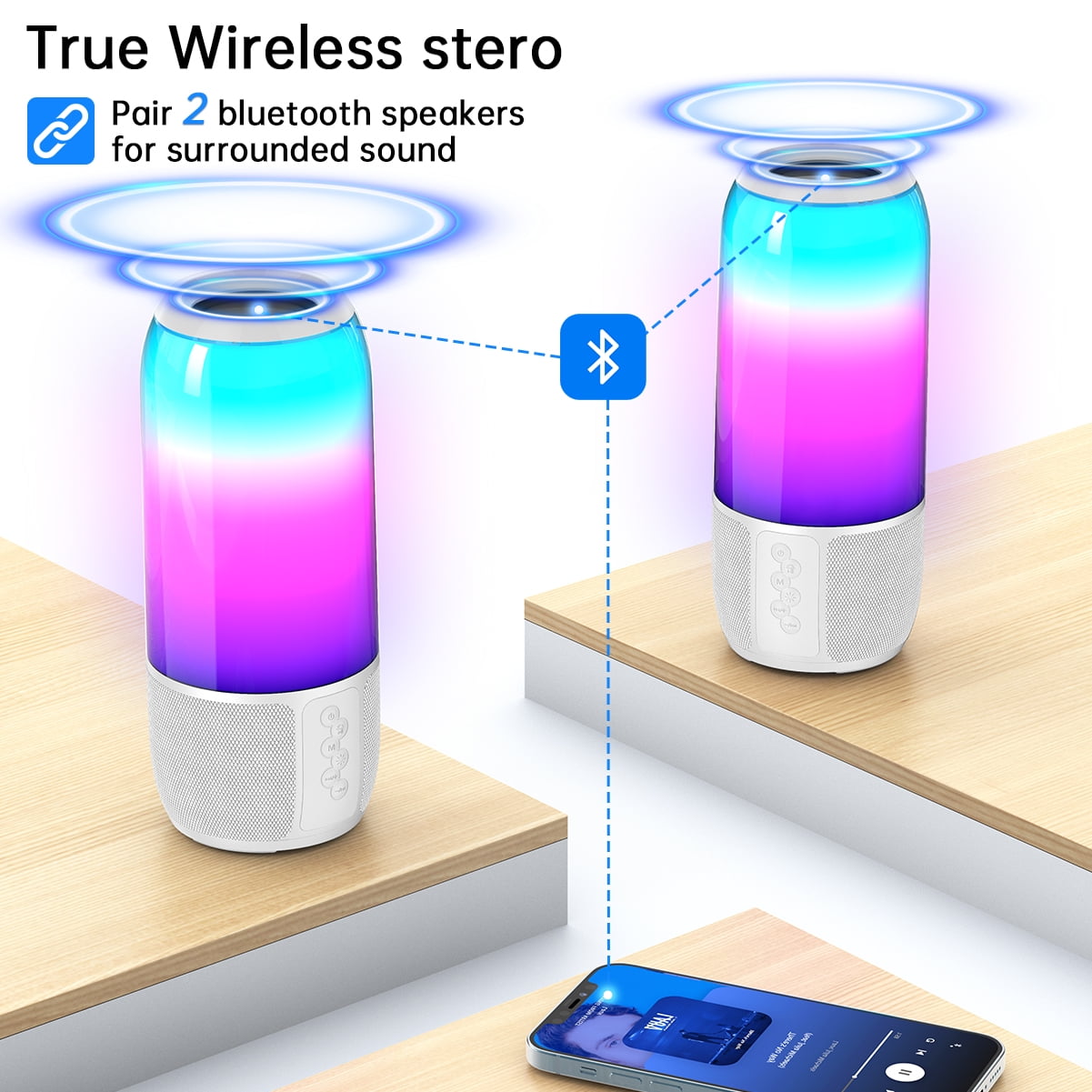 【Unbelievable Sound】 The Bluetooth speaker equips two stereo full-range driver speakers and an advanced digital signal processor, which pumps out crisp treble, and detailed mid-bass, delivering shocking sound without distortion even at any volume. You can also pair 2 Bluetooth speakers. Combined outputs produce full stereo, lifelike sound.