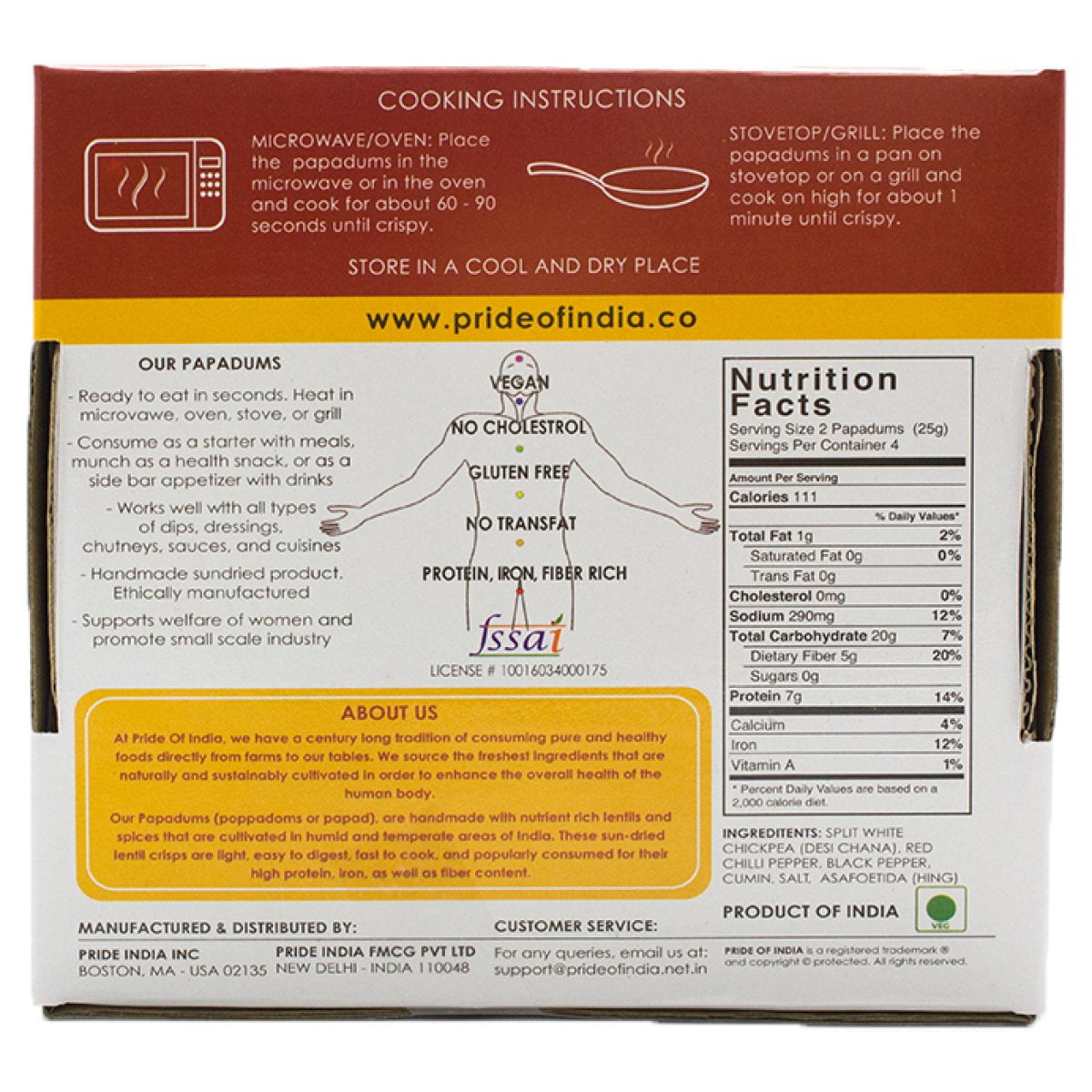 Pride of India – Spicy Chickpea Masala Papadum Lentil Crisp, Indian papadums (poppadoms or papad) are a traditional Indian snack food. They are similar to tortillas and flatbreads. Our Spicy Chickpea Masala Papadum Lentil Crisp is made of chickpeas, lentils and Indian spices. Lentils contain healthy protein, iron, and fiber. Plus, they help reduce cholesterol. Because these lentil crisps are gluten free and don’t have trans fats, they are a healthier snack than traditional potato chips. These papadums are also handmade by women in India, and each purchase of these lentil crisps contributes to small businesses and women empowerment in India. Popadums are usually made as a dough that needs to rest before baking. These lentil crisps, however, are ready in seconds! Just put them over a heat source (oven, microwave, stove, etc.) for 60 to 90 seconds until crispy. Lentil crisps are a great meal starter or snack. With an intoxicating blend of Indian spices, you can eat them alone or dip them in sauces, curries, or hummus. This package contains 10 chili chickpea spicy papadum. Try other flavors of lentil crisps, and shop other health and beauty products by Pride of India