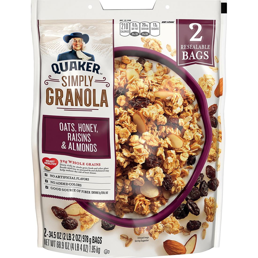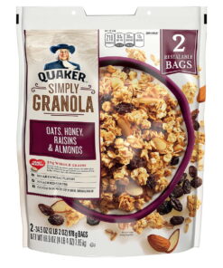 Get 5g of protein and fiber with each serving of Quaker Simply Granola Oats 34.5 Oz. Honey, Raisins and Almonds Cereal. Add it to a bowl of milk, or snack on it throughout the day for a hearty dose of whole grain oats.Quaker Simply Granola Oats, Honey, Raisins and Almonds, 2 pk./34.5 oz.