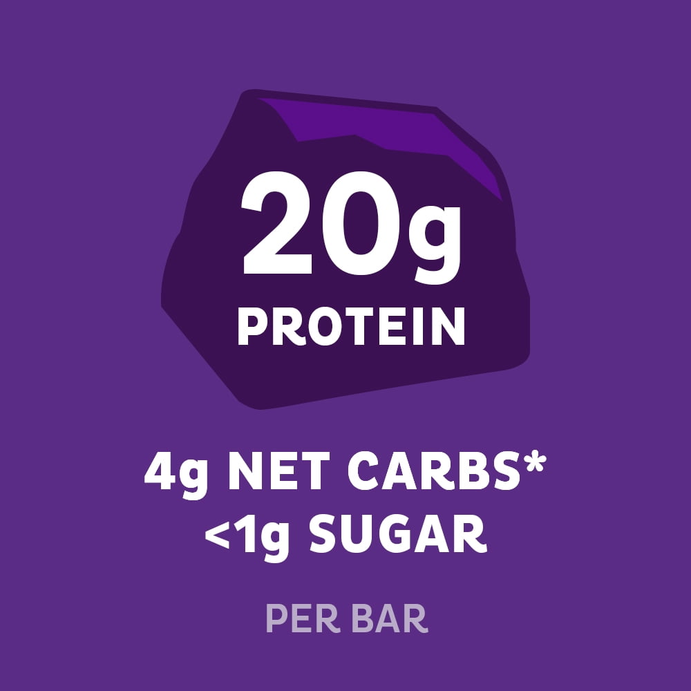 An indulgent and sweet chocolate flavored protein bar with chocolate chunks throughout with 20g of protein and 1g of sugar.