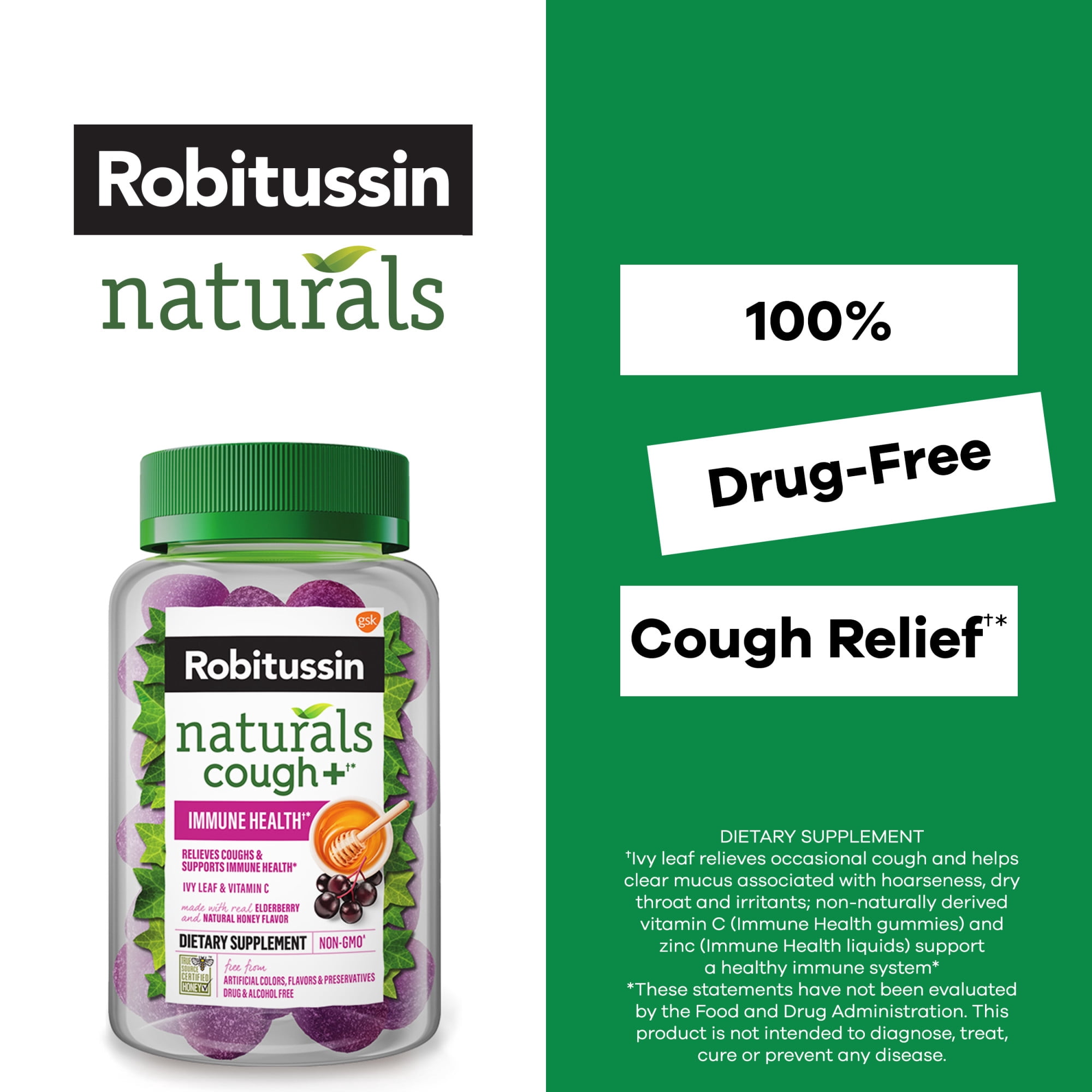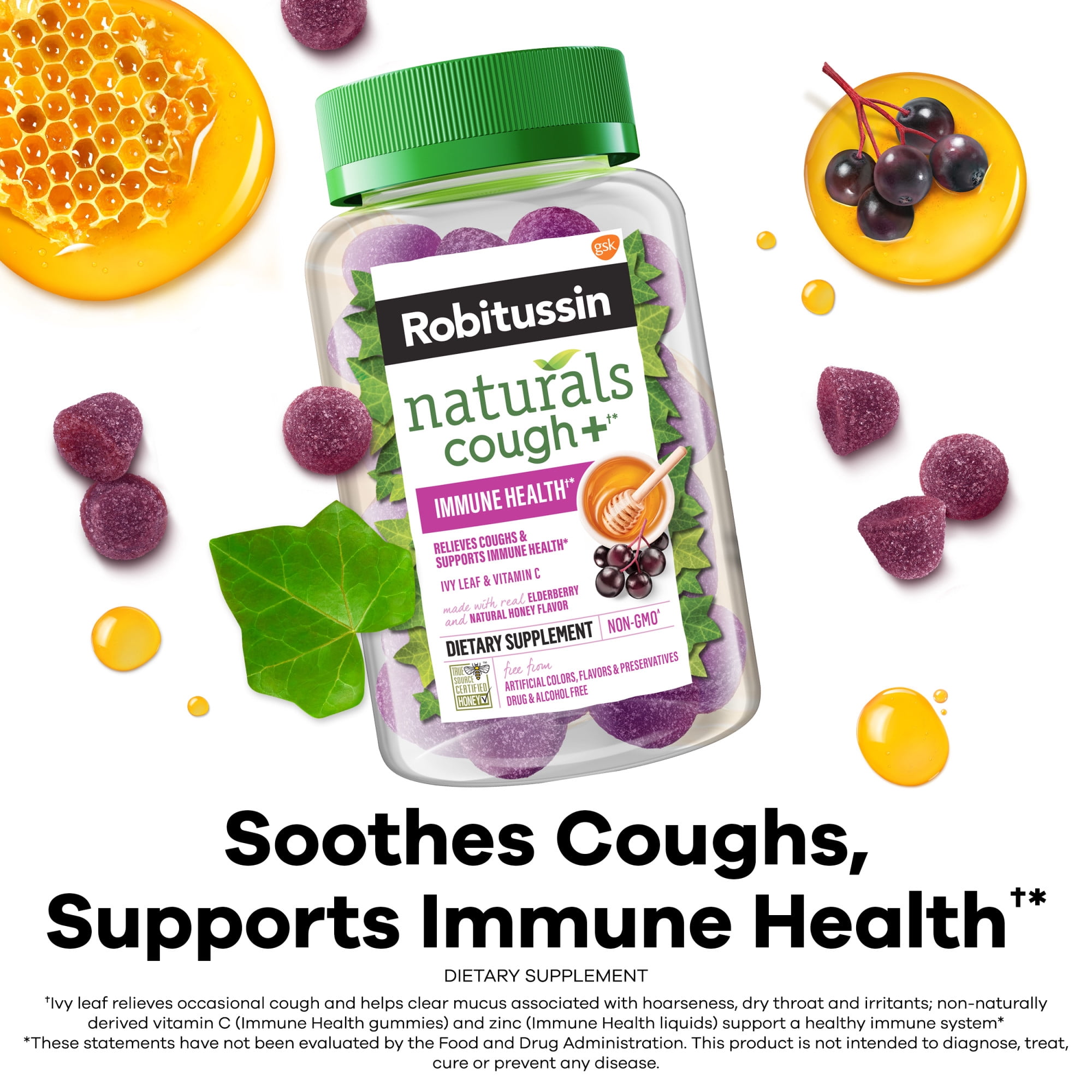 Robitussin Naturals Cough Relief & Immune Health Gummies relieves coughs, helps clear mucus, and supports immune health. ‡* Made with real ivy leaf, which relieves the occasional cough associated with hoarseness, dry throat, and irritants, they are also packed with vitamin C to support a healthy immune system.* These cough relief gummies for adults boast a natural fruit flavor thanks to ingredients like real honey and real elderberry. Free from artificial colors, flavors, and preservatives, these dietary supplements by Robitussin are non-GMO, and drug and alcohol-free.^ They are also gluten-free and suitable for vegetarians. Robitussin Naturals Cough Relief & Immune Health Gummies are suitable for adults. The recommended serving for adults is three (3) gummies per day as needed. Adults should chew the gummy thoroughly before swallowing. These gummies are not formulated for use in children. Robitussin has been an expert at making trusted cough relief products for over 70 years and is now expanding to bring consumers dietary supplements like Robitussin Naturals. With a wide range of products to suit your needs, Robitussin understands the importance of feeling confident in the products you use. Whether you need a product for cough, cold, or flu symptoms, or a dietary supplement like Robitussin Naturals for occasional cough, Robitussin can help! ‡ Ivy leaf relieves occasional cough associated with hoarseness, dry throat and irritants and helps clear mucus when coughing; vitamin C supports a healthy immune system* * These statements have not been evaluated by the Food and Drug Administration. This product is not intended to diagnose, treat, cure, or prevent any disease. ^for more information on our non-GMO standard, visit robitussin.com