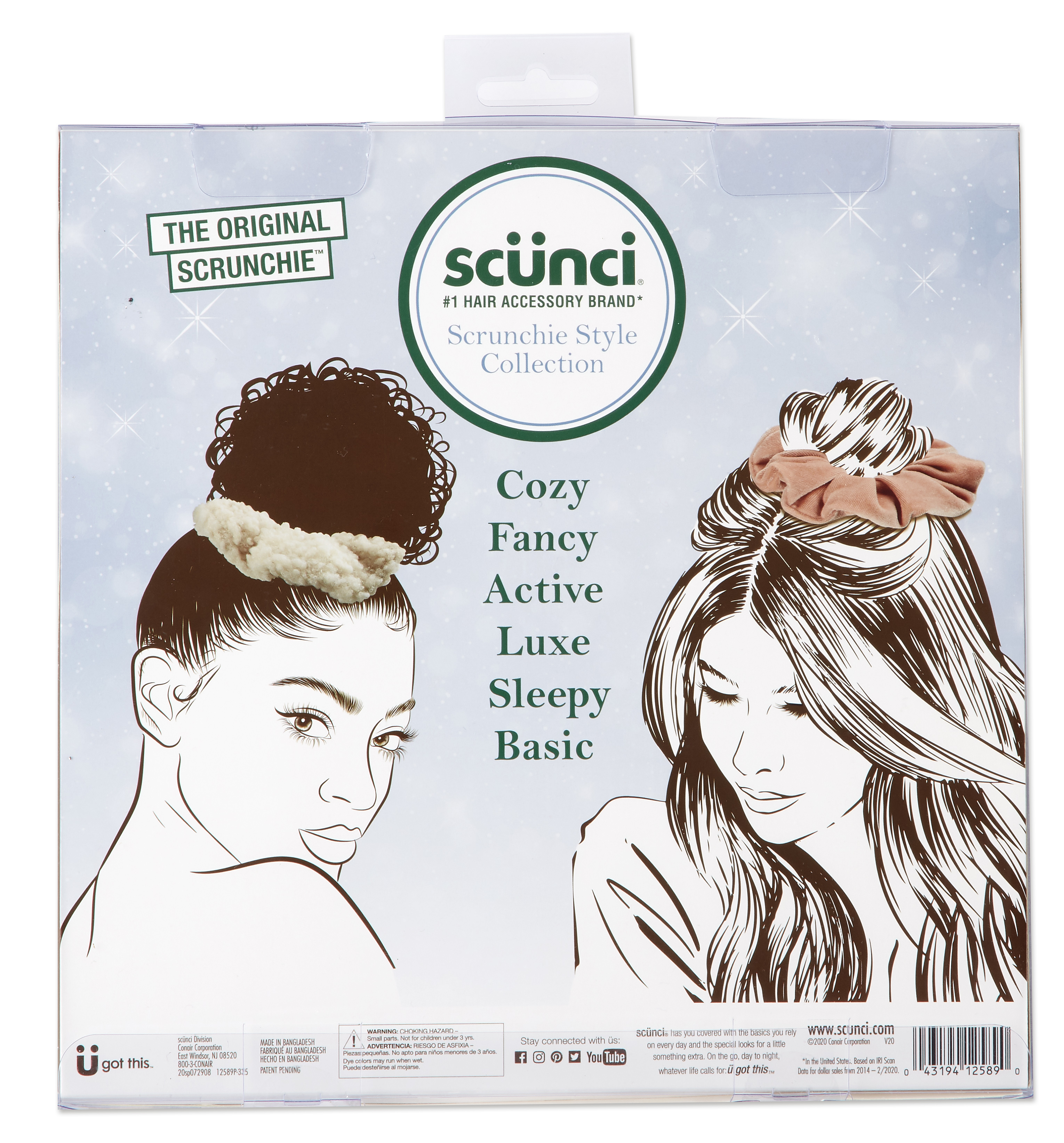 What’s better than a big bunch of scünci original scrunchies? Nothing! This collection of six scrunchies comes in a variety of colors, including faux shearling, gray satin, and more! Because holiday time is party time, scünci includes a gold ribbed metallic scrunchie and a super soft pink velvet scrunchie to look your best during all your holiday festivities. Scünci, The Original Scrunchie™. About scünci hair accessories: When it comes to keeping your look on trend, scünci has you covered with today’s hottest hair accessories, including stylish headbands, super-comfy scrunchies, glitzy bobby pins, glam barrettes, and much more. From work to workouts to nights out, scünci lets you express your personal style and gets you ready for any occasion. Take control of your hair and look amazing whatever you do and wherever you go. Whether bling is your thing or casual is your calling, with scünci, ü got this. • The Original Scrunchie™ • Boxed set of six scrunchies • Mix of luxurious colors and fabrics • Perfect for the holidaysScunci Cozy Style Scrunchie Gift Box