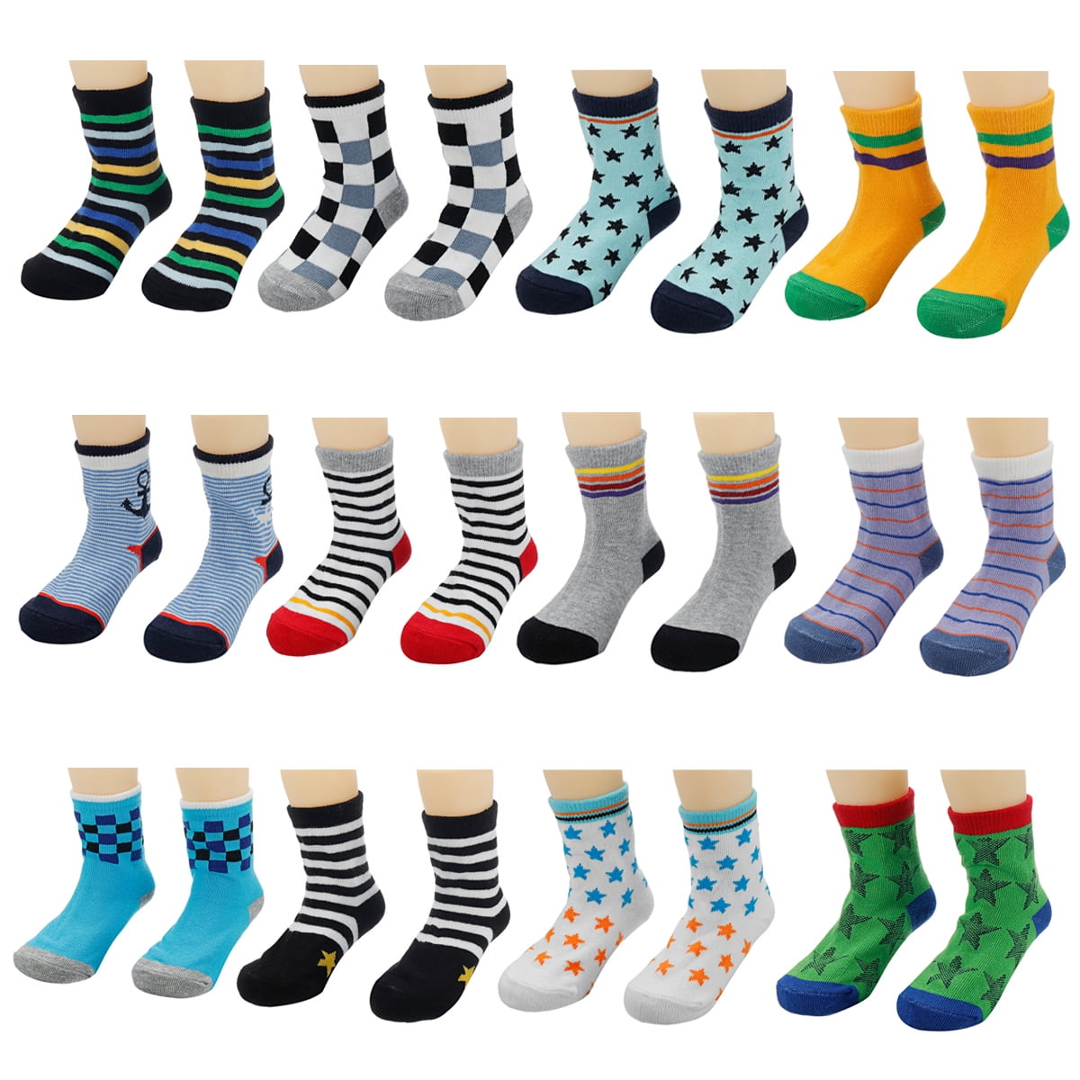 12 Pairs Unisex Baby Toddler Socks in assorted colors and patterns.