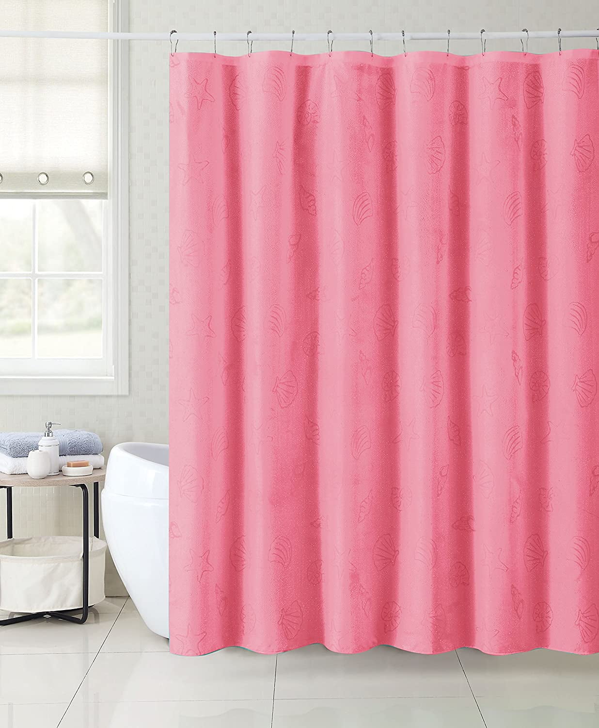 Vibrant color shower curtain that changes when wet. Ocean shore shells magically appear. Give your bathroom a beautifully designed makeover with this shower curtain. Creates a welcoming guest bath or a sophisticated master bath with this simple addition.
