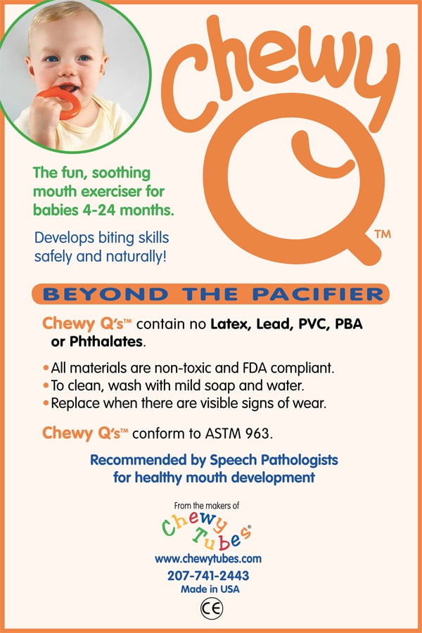 Speech Pathology LLC Chewy Q’s encourage early mouthing experiences that support the transition from midline tongue exploration to lateral jaw movement. Contains no latex, lead, PVC, PBA, or phthalates. Made with all non-toxic materials and is FDA compliant. Replace when there are visible signs of wear. Use of this product should be supervised by an adult at all times. Conforms to ASTM 963. Recommended by Speech Pathologists for healthy mouth development.