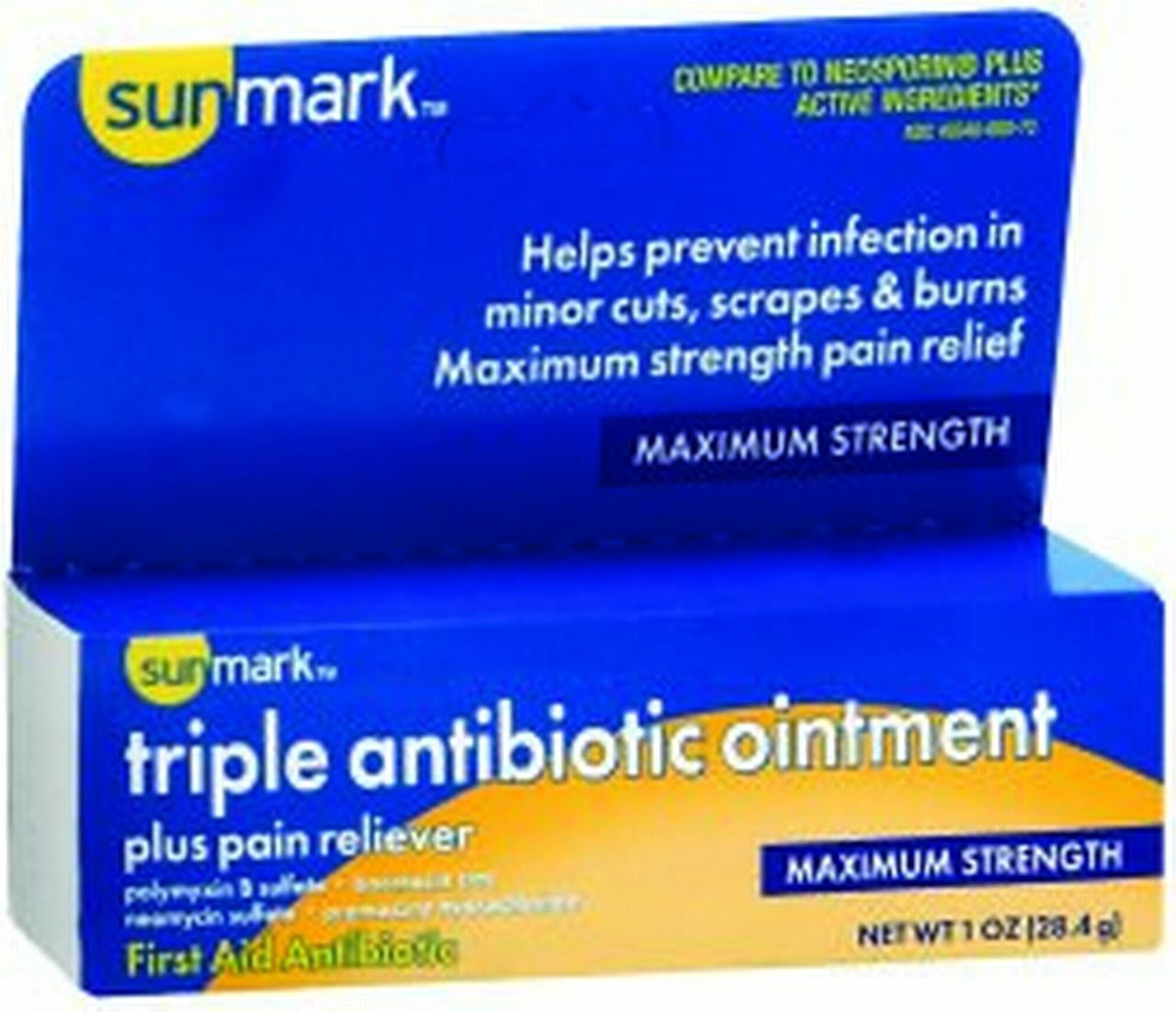 sunmark First Aid Antibiotic with Pain Relief Ointment 1 Ounce Tube, 49348060072 – PACK OF ONE. Brand: sunmark. Manufacturer Name: McKesson Brand. Manufacturer Number: 49348060072. Application: First Aid Antibiotic with Pain Relief. Active Ingredients: Bacitracin / Neomycin / Polymyxin B / Pramoxine HCl. Container Type: Tube. Latex Free Indicator: Not Made with Natural Rubber Latex. Strength: 500 IU – 3.5 mg – 10,000 IU – 10 mg / Gram Strength. SOLD BY: PACK OF ONE. Maximum strengthBacitracin zinc 500 units, Polymyxin B sulfate 10,000 unitsCompare to active ingredient in Polysporin1 oz. tubePolysporin is a registered trademark of Johnson & Johnson Consumer Incsunmark First Aid Antibiotic with Pain Relief Ointment 1 Ounce Tube, 49348060072 – SOLD BY: PACK OF ONE