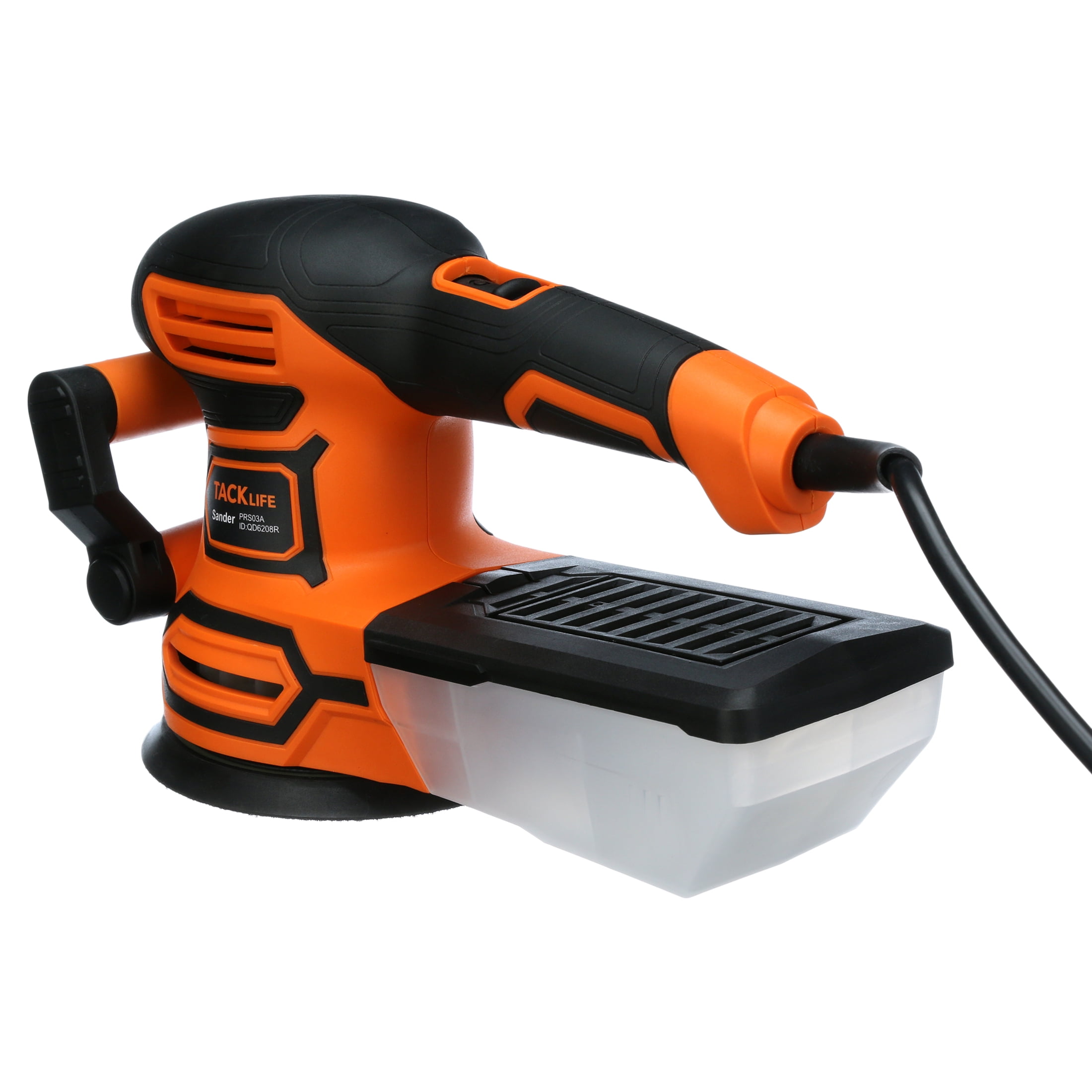 Tacklife-PRS03A-450W big round sander. Superb Ergonomic Design: The ergonomically designed handle with a soft rubber grip fits your hand perfectly and provides maximum control and comfort. The dust-proof switch keeps the sander away from dust contamination, which greatly extends its service life. The hook and loop design are able to help the user quickly replace the sandpaper. Low Vibration and Noise. The design of the built-in metal balance block greatly reduces the vibration of the fuselage when working, and the soft rubber handle makes you hardly feel the vibration. The thickened body also makes the noise of this electric sander at work smaller, which greatly enhances your experience.