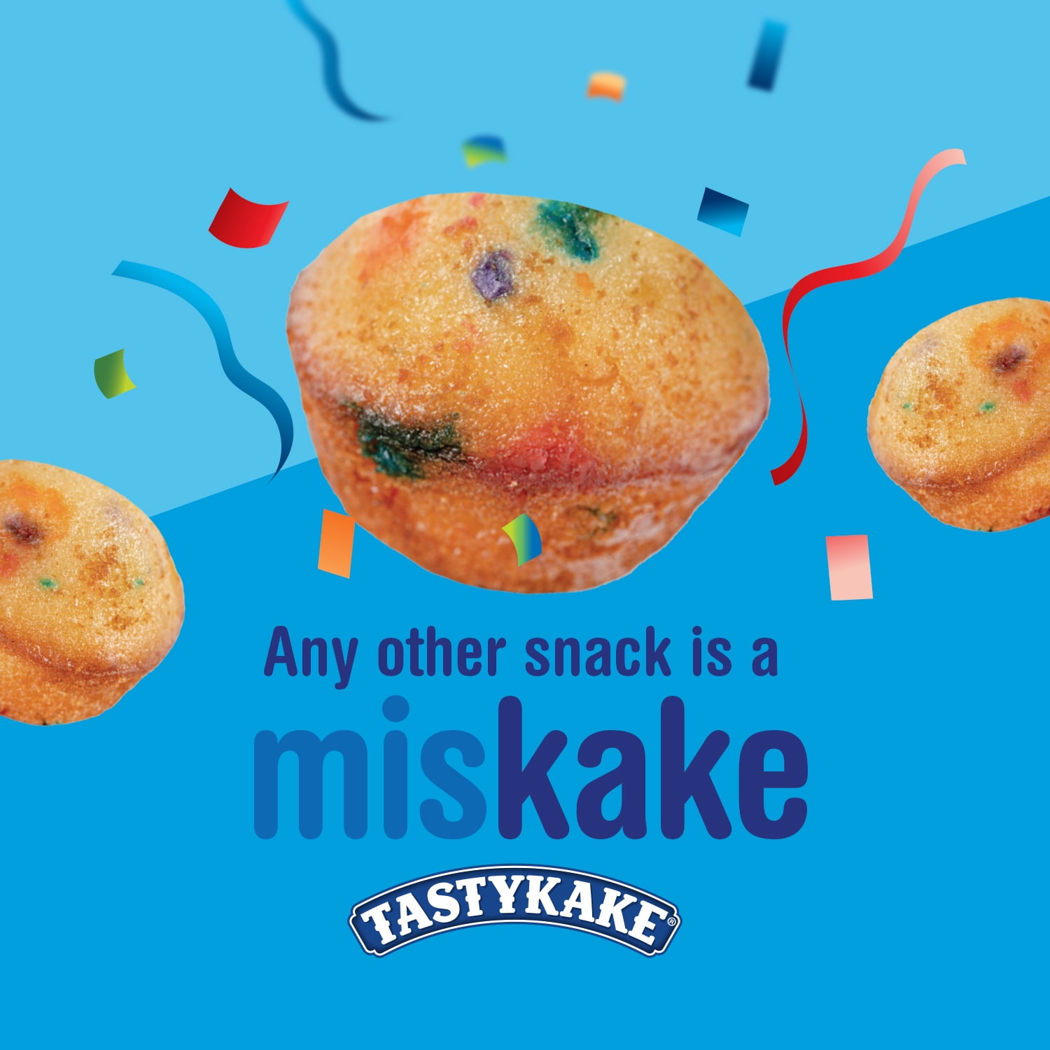 Tastykake Mini Muffins are here to delight your tastebuds in each tasty mini bite. These mini confetti cake muffins are free from high fructose corn syrup and have 0g trans fat per serving. Tuck these portable packs into lunch boxes, keep a box or two in the pantry for afterschool or even toss a pack into your handbag for on-the-go snacking. Tastykake Mini Muffins are yummy at any age. Keep Tastykake on hand, because having any other snack is a miskake. Tastykake has baked iconic treats for over 100 years, creating tasty cakes, muffins, donuts, pastries, pies and more. With so many delicious and unique treats to choose from and so many happy snack-lovers, why would you ever choose another brand? Whether it is a quick bite on-the-go or a reward after a long day, at Tastykake, we take snacking seriously, and our products are here to satisfy. Choose Tastykake and accept no substitutes.