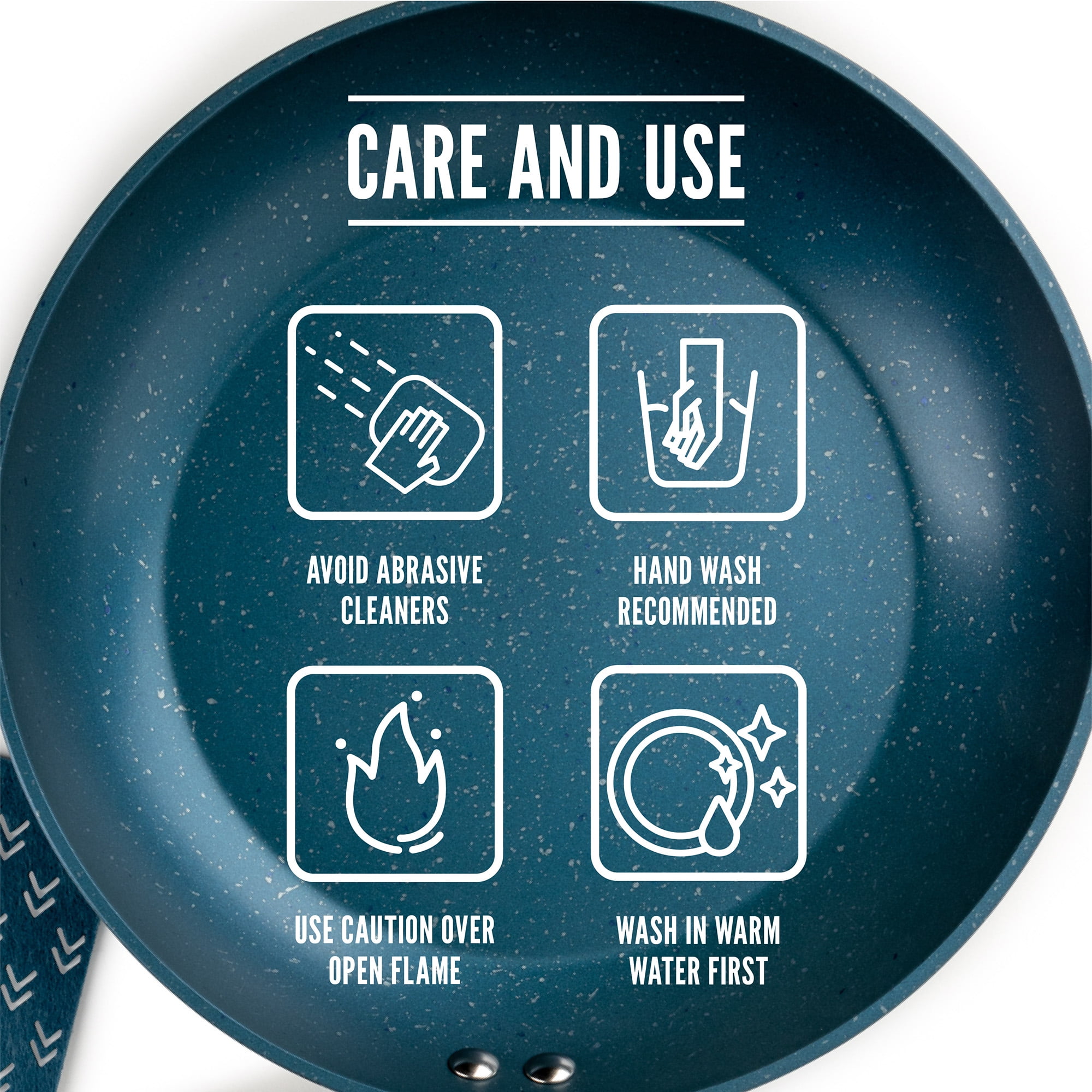 Wash in warm water before first use. Do not soak for extensive periods. Hand wash recommended for product’s longevity. Do not use in microwave. Do not use lid in oven. Avoid abrasive cleaners. Avoid using steel wool, steel scouring pads, or harsh detergents. Always use caution when handling over open flame.