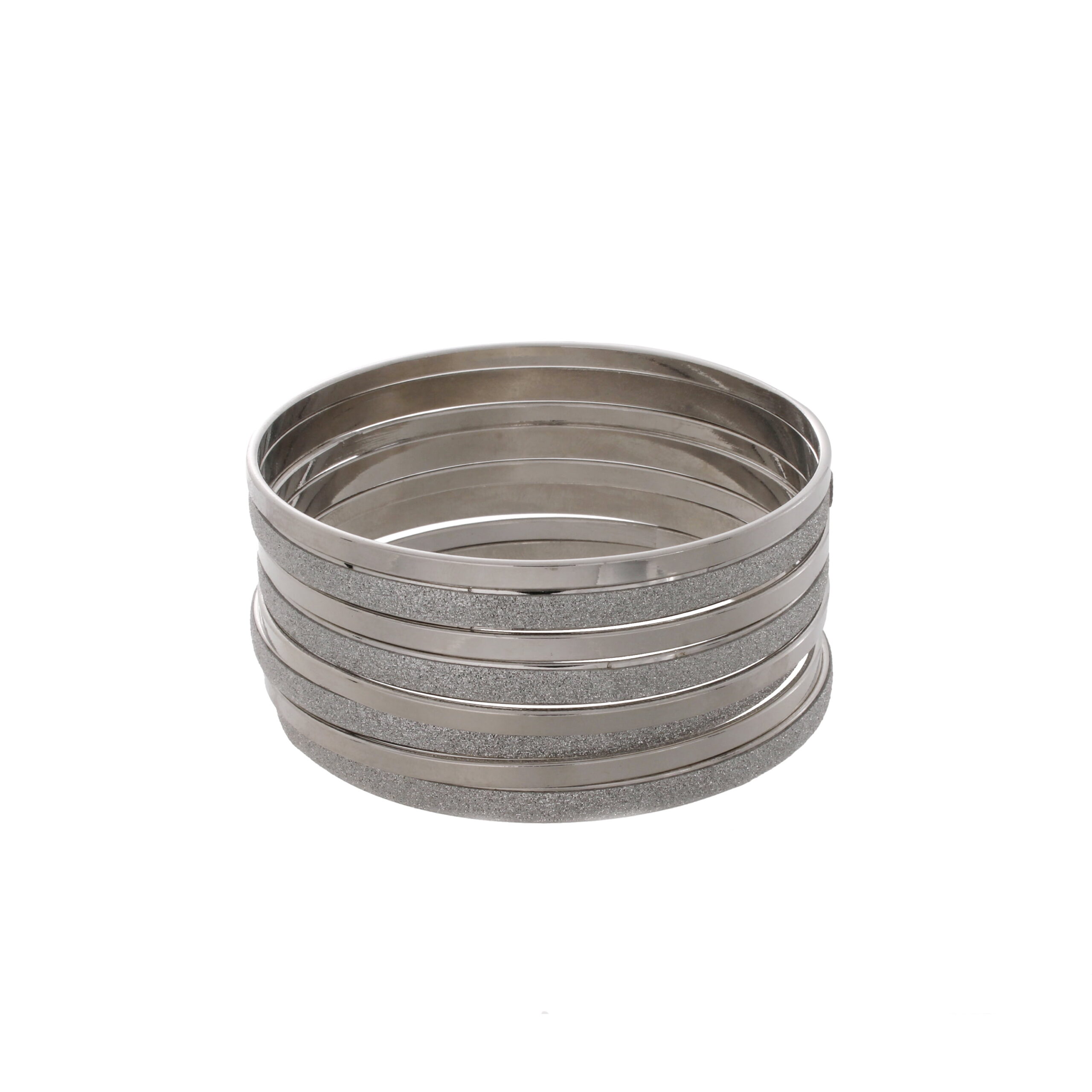 This eight piece silver glitter and silver tone bangle set will add a chic finishing touch to any outfit. A classic and contemporary look, it’s the perfect addition to your essential jewelry collection.8 Piece