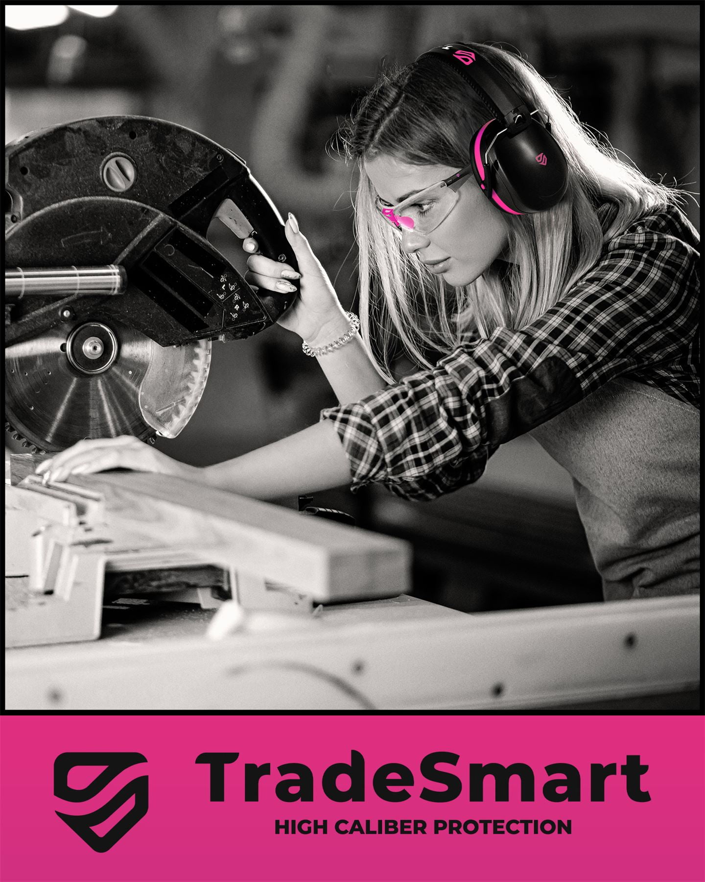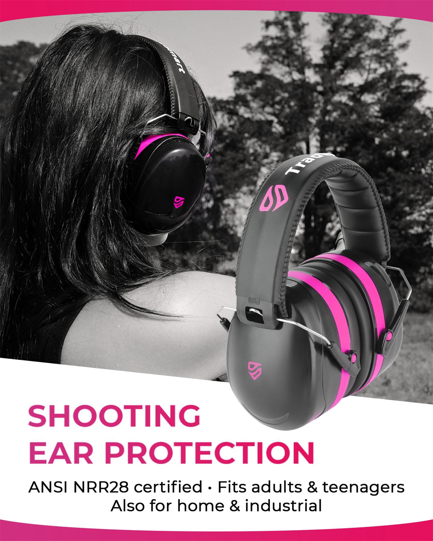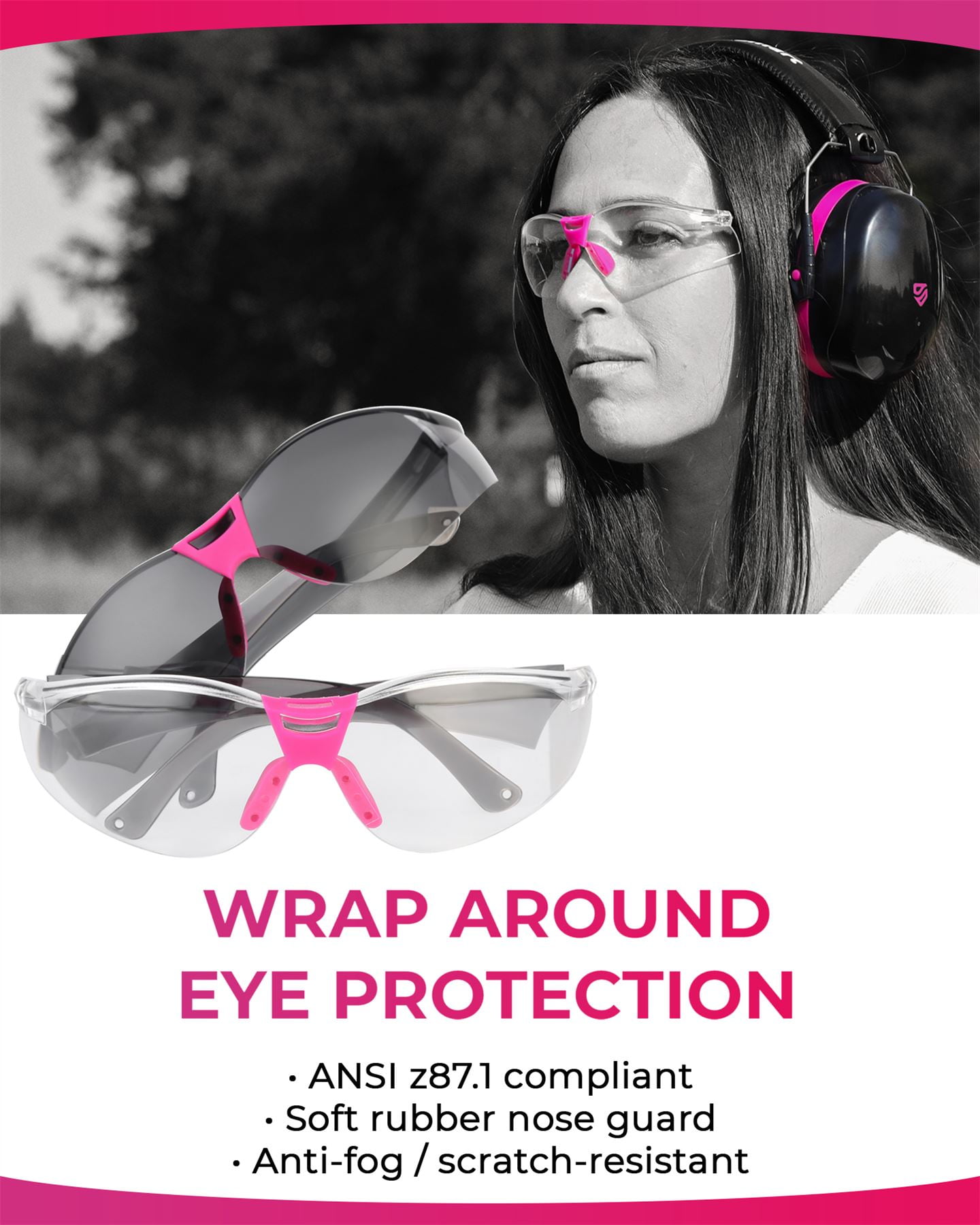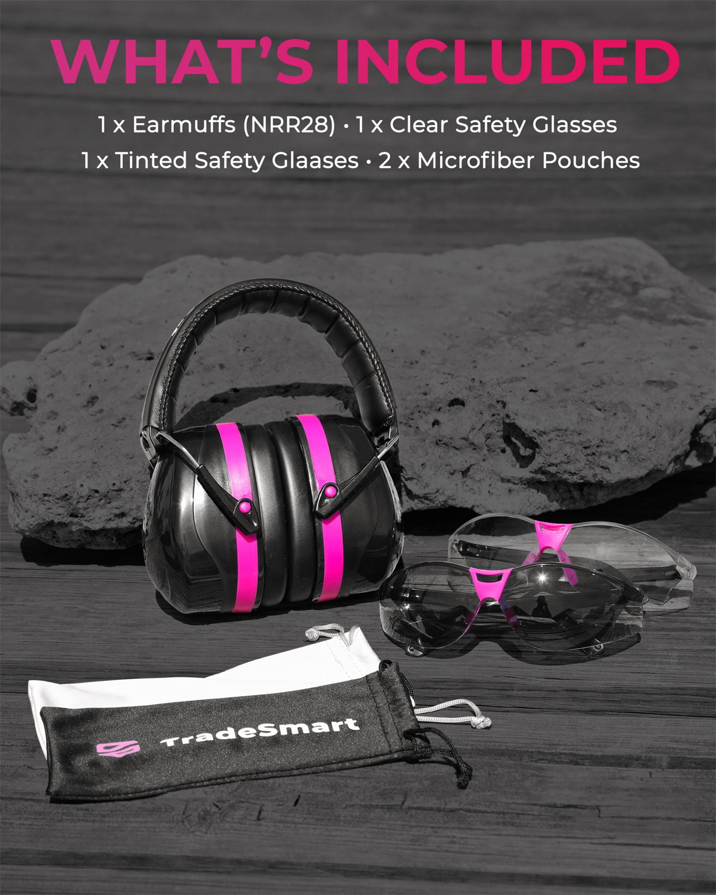 - Package content: 1 x pink safety ear muffs, 1 x clear safety glasses, 1 x tinted glasses, 1 x hard carrying case so you can keep your gear safe and neat in one place