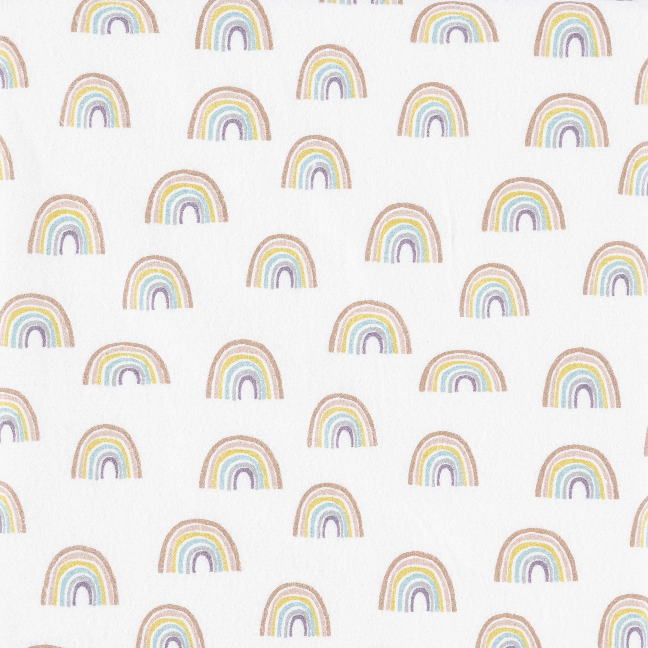 Make your little one’s playard cozy with Trend Lab’s Rainbow Daisy 2 Pack Flannel Playard Sheets. The 100% brushed cotton flannel fabric has just the right amount of padding for a little extra cushion in the playard. One features a white daisy print, with eggplant purple leaves on a golden yellow background. The other features a rainbow sketched print in peach, rose, golden yellow, blue haze, lilac, and dusty blue. Playard sheets fit a standard playard mattress and measures 28 in x 40 in with 5-inch-deep pockets. Additional colors, prints and flannel products from Trend Lab are sold separately. Please adhere to JPMA’s Safe Infant Bedding Practices.