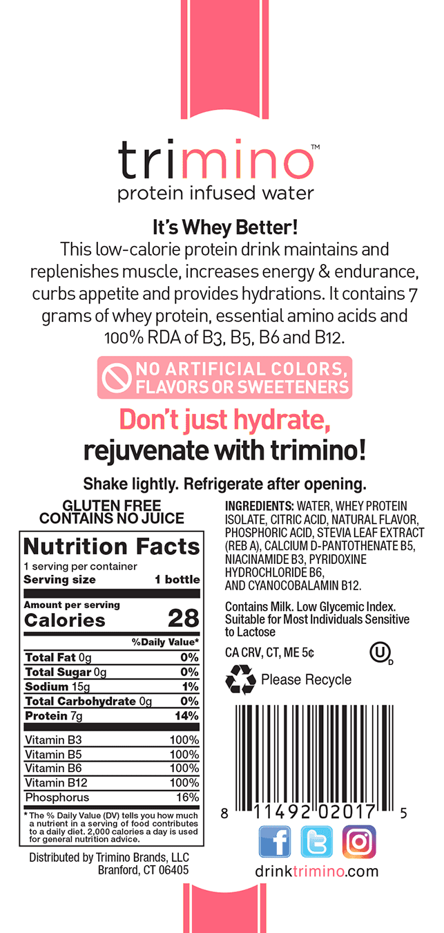 This low calorie protein drink maintains and replenishes muscle, increases energy and endurance, curbs appetite, and provides hydration. It contains 7 grams of protein, essential amino acids, and 4 Essential B Vitamins. Protein isn?t just for athletes! It?s for everyone! Drink trimino to break the monotony of water.