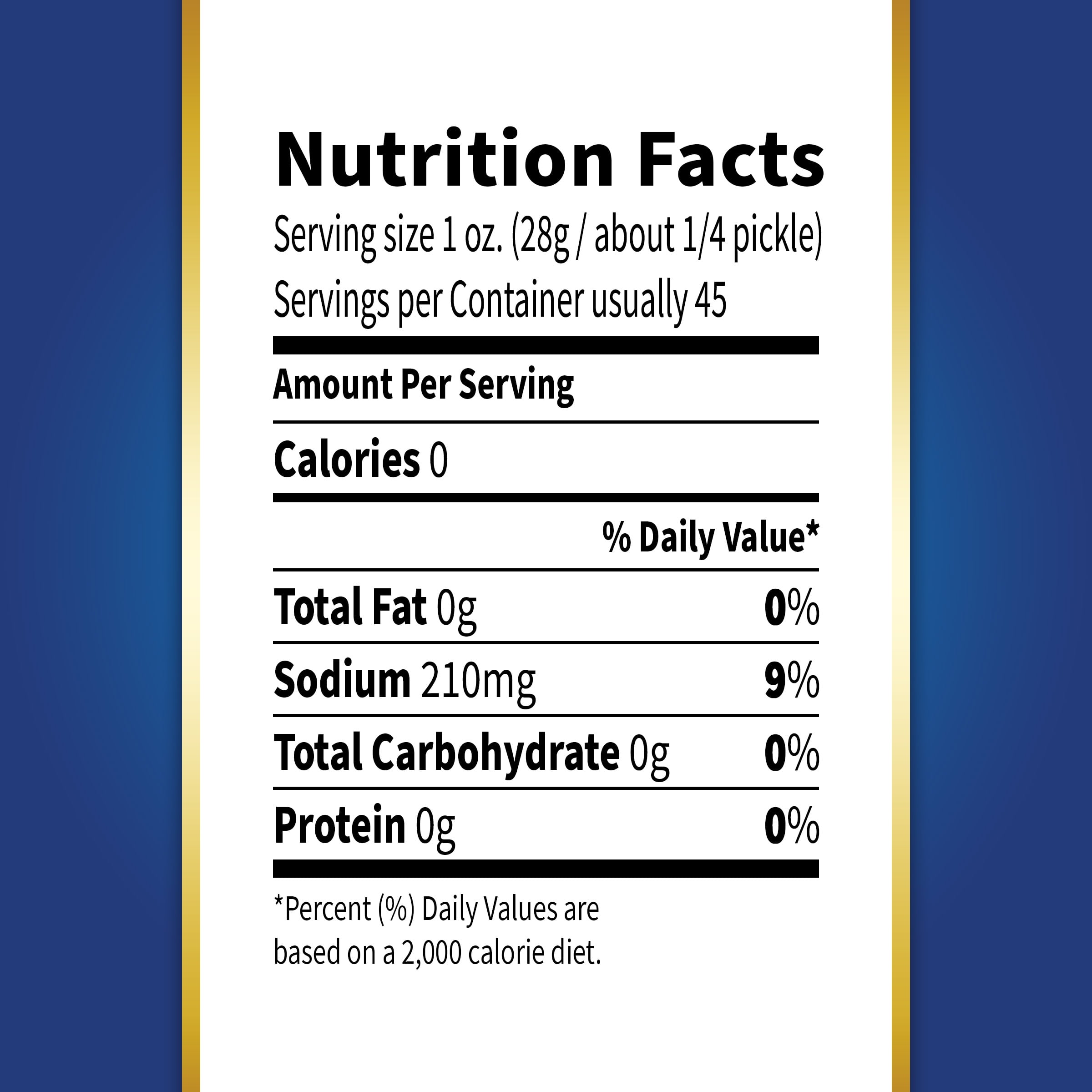 Vlasic Kosher Dill Whole Pickles are deliciously crunchy. All ingredients, along with the Vlasic secret pickling recipe, make these Kosher dill pickles tasty. These snack pickles contain 0 calories per serving and deliver one-of-a-kind crunch your entire family loves. Kosher pickles are ideal for serving alongside hamburgers, hot dogs and sandwiches, or eat them right from the jar as a satisfying snack. Vlasic Kosher Dill Whole Pickles are packed in a resealable 80 fluid ounce jar to keep them crunchy and delicious. Vlasic offers several flavors and sizes of pickles, peppers and relish. Keto Friendly: 1g net carbs (1g total carbs minus 0g dietary fiber), and 0g added sugar per serving.