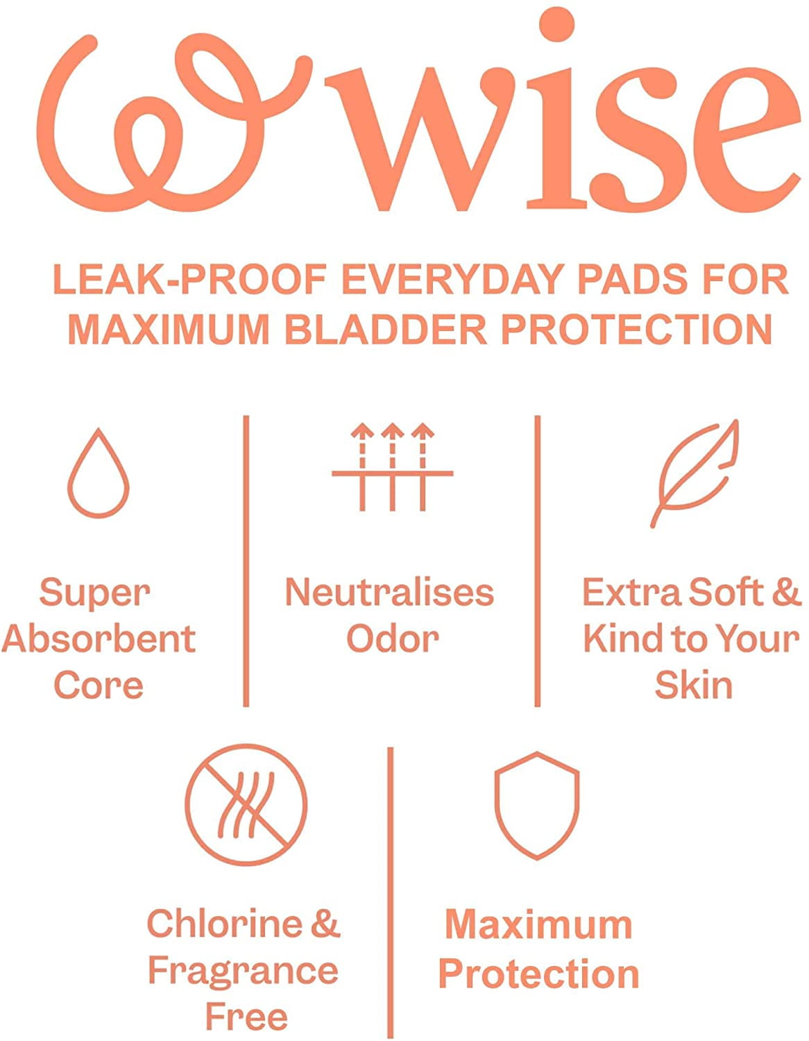 - EXPERIENCE ALL-DAY PROTECTION – WiseWear Maximum Incontinence Pads provide all-day protection from wetness, odor and embarrassing leaks. These bladder control pads feature a soft, cloth-like outer fabric for ultimate comfort. The absorbent core is designed for maximum rapid absorbency and helps keep skin dry. Each pad has a moisture-proof barrier for extra leakage protection. An ideal choice for incontinence and/or postpartum pads.