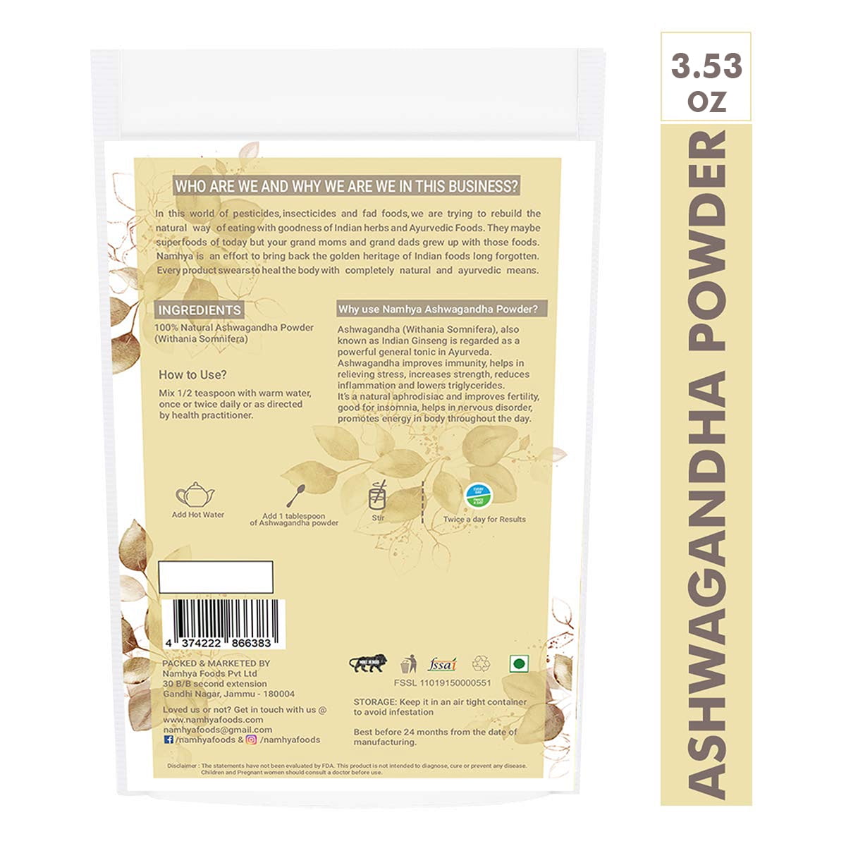 NAMHYA Original Super Herb Ashwagandha Powder for Overall Immunity Booster and Natural Source of Energy with Anti Oxidants 3.53 oz (100 Grams)