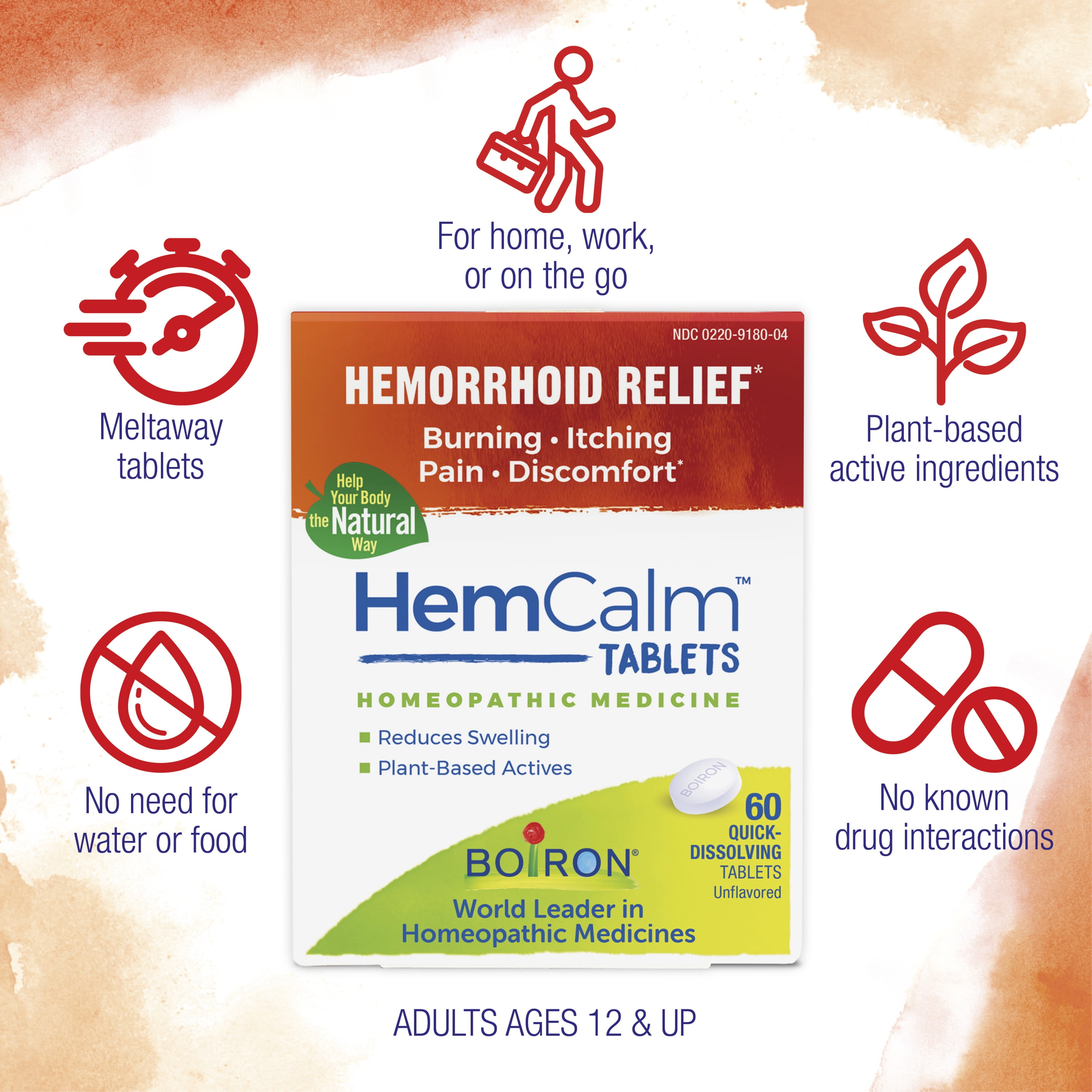 Boiron HemCalm Tablets, Homeopathic Medicine for Hemorrhoid Relief, Burning, Itching, Pain, Discomfort, 2 x 60 Tablets Twin Pack