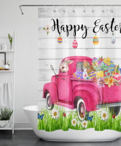 HVEST Happy Easter Shower Curtain for Bathroom,Easter Egg and Rabbit on Truck Decor Accessories Bath Curtain,Farmhouse Rustic Plank Polyester Waterproof Fabric Shower Curtain with Hooks,60×72 Inches