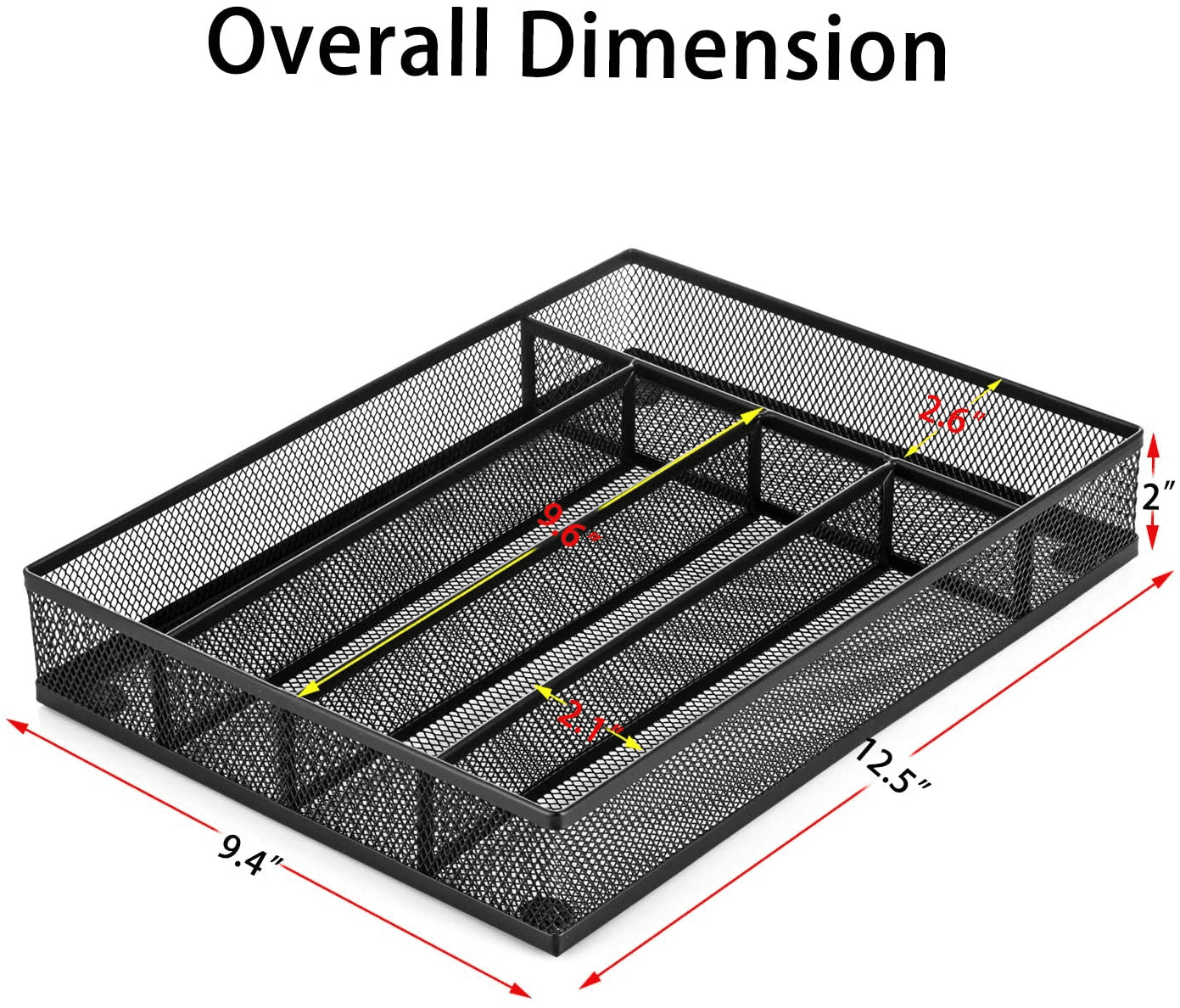 - 5 Compartments- Easily accommodate your silverware storage needs. The silverware tray will not collect dirt and/or grime like similar plastic trays. Dimensions: 12. 5" X 9. 4" X 2"