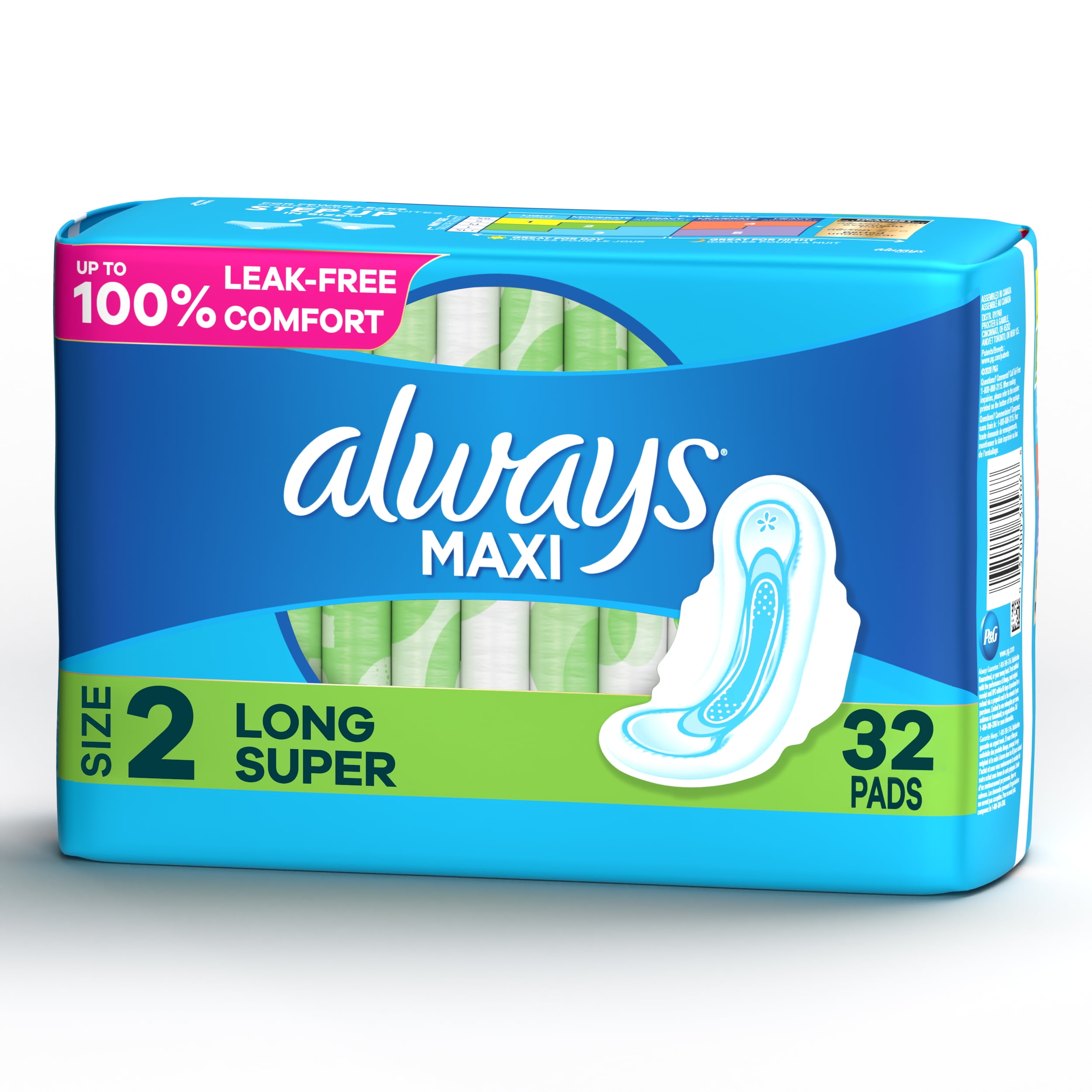Always Maxi Pads with Wings, Long Super Absorbency, Size 2, 32 Ct