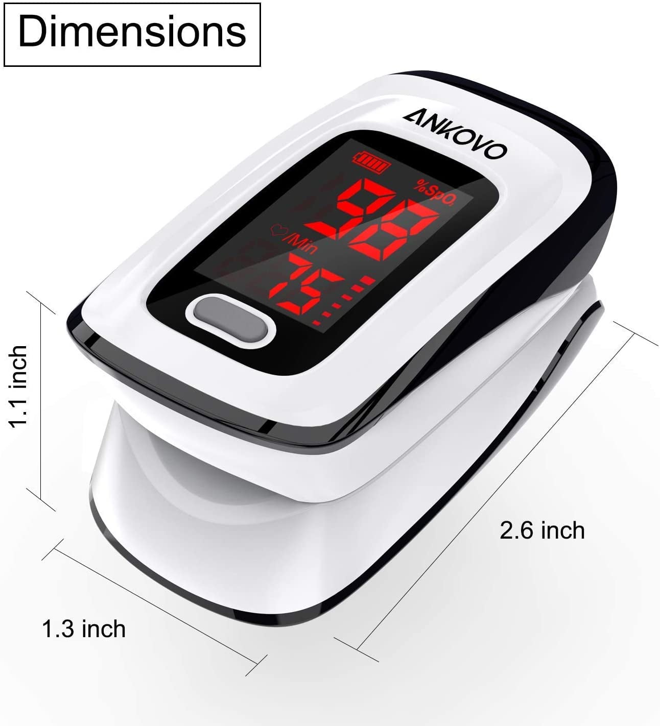 ANKOVO Finger Pulse Oximeter reads accurate oxygen saturation and pulse rate, it is perfect for exercise enthusiasts, athletes, and those who need to monitor their blood oxygen circulation and heart rate. Please note that this device is for Sports & Aviation use only and is not a medical device. Operation Steps: 1.Stick one finger completely into the finger chamber of the oximeter. The fingernail should be facing upward 2.Release the clip and press the power-on button to power on the pulse oximeter. 3.Don’t tremble your finger when the Oximeter is working. Your body is not recommended on moving status. 4. The oximeter will automatically shut down 10 seconds after you remove your finger. Package List: 1.One Pulse Oximeter 2. User Manual 3. 2x AAA Batteries 4. Lanyard