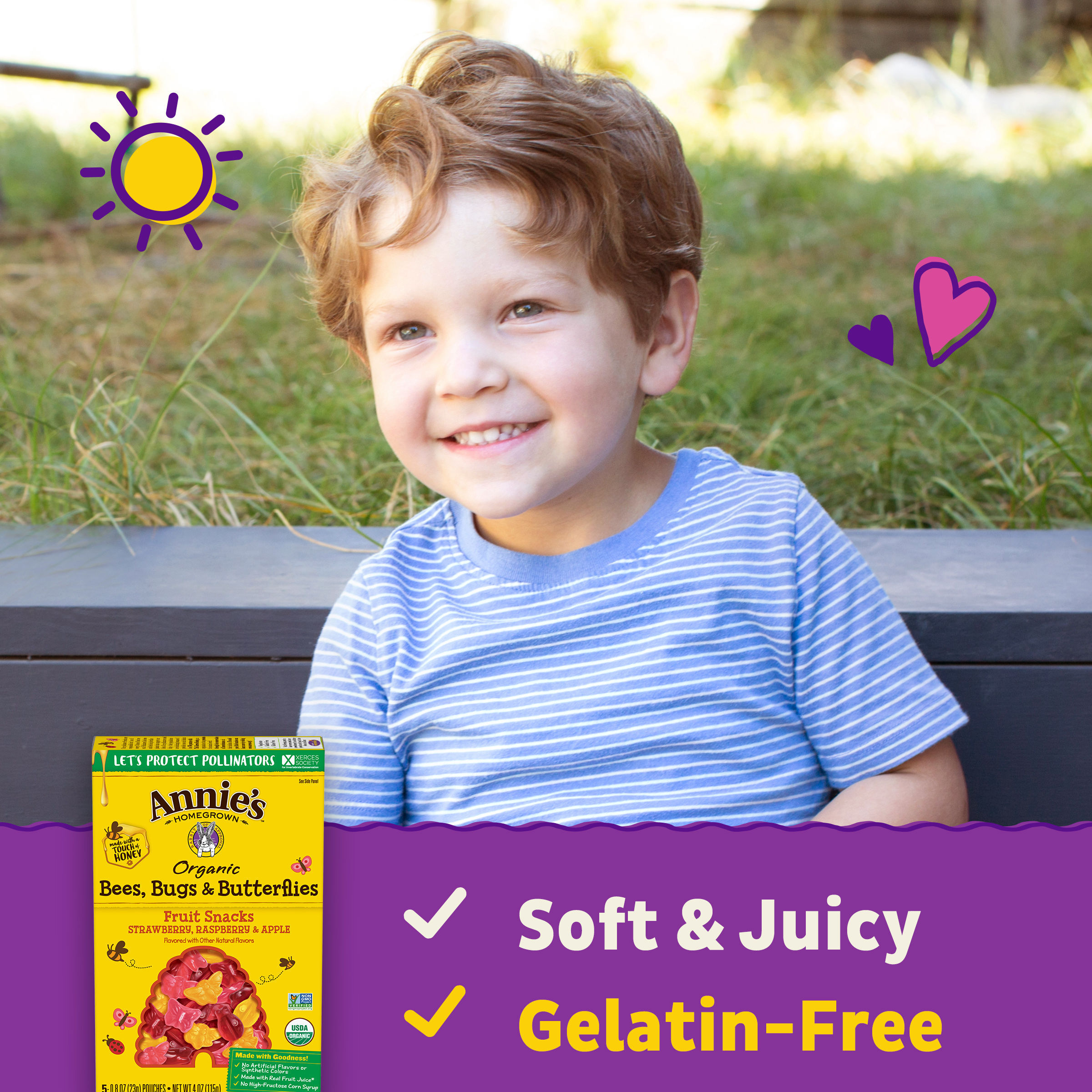 Annie’s Organic Bees, Bugs, and Butterflies Fruit-Flavored Snacks are equal parts adorable and delicious! Each fruit gummy is made with real fruit juice* and packs bold strawberry, raspberry and apple flavors with a touch of honey into fun insect shapes. A pouch of these vegetarian and gluten-free fruit-flavored snacks turns snack time into outdoor fun. The best part? These fruit-flavored gummies are made with certified organic ingredients and celebrate our partnership with The Xerces Society, an organization that protects the natural world through the conservation of invertebrates and their habitats.*These fruit snacks are made with organic pear juice concentrate. See nutrition panel for a complete list of ingredients. They are not intended to replace fruit or vegetables in the diet.Annie’s makes products in over 20 family-friendly categories — from fruit-flavored snacks and cereal to mac & cheese. We want to make a healthier and happier world by spreading goodness through nourishing, tasty foods and kindness to the planet.