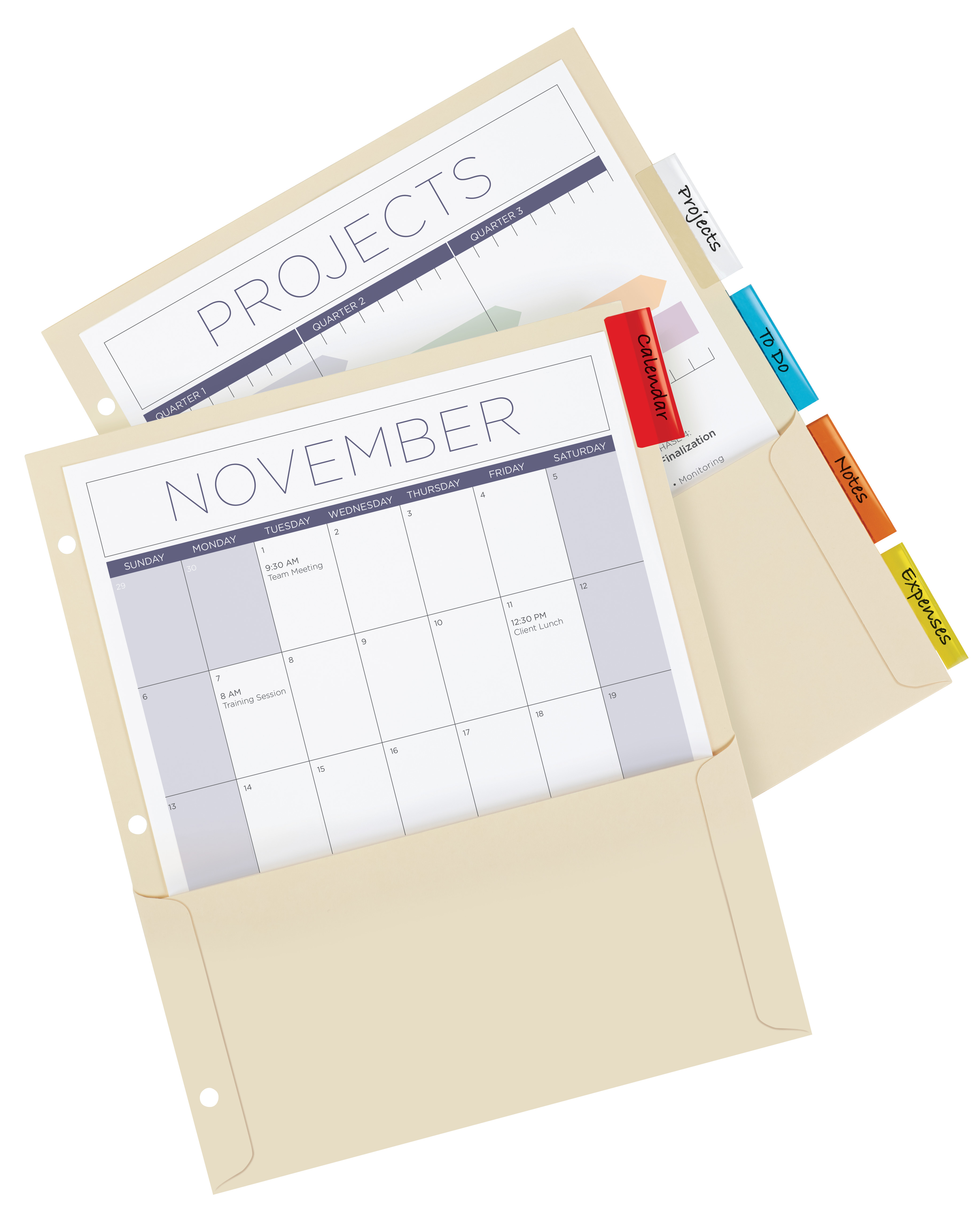 These manila-colored Insertable Dividers offer multicolored tabs for quick and easy referencing. The dividers feature durable pockets for storing loose papers, while reinforced holes provide extra tear resistance so dividers stand up to everyday use. A unique tab design keeps your inserts from falling out with the help of a secure indent point at the base of the tabs.