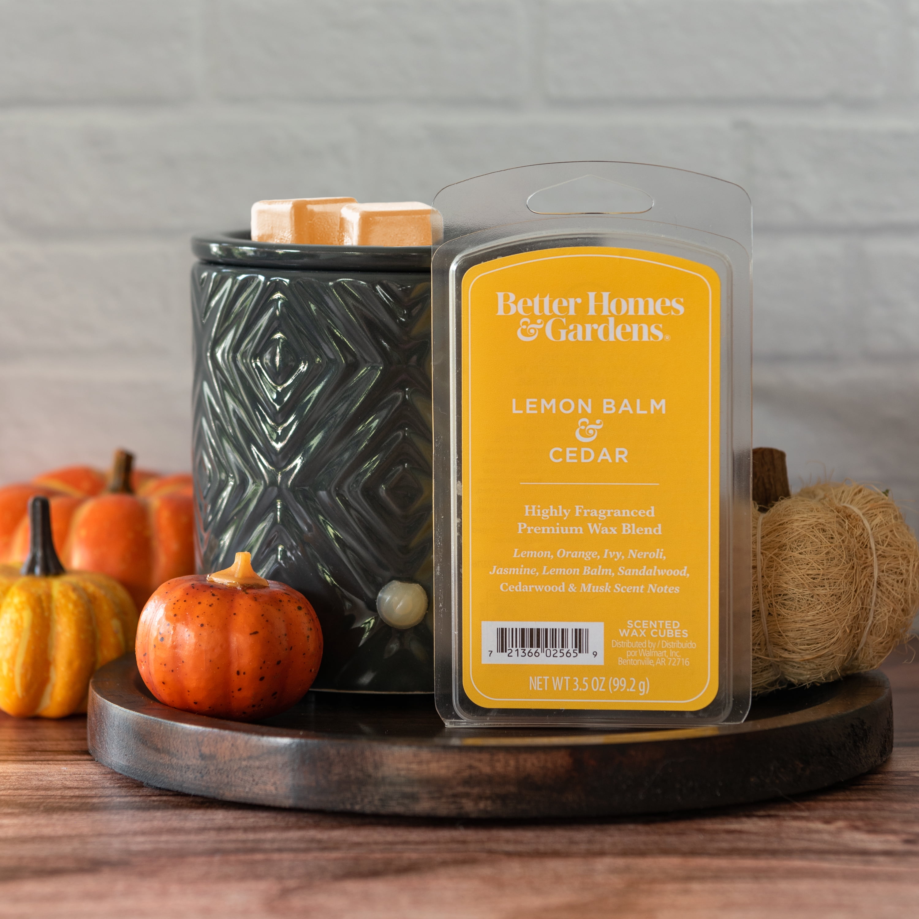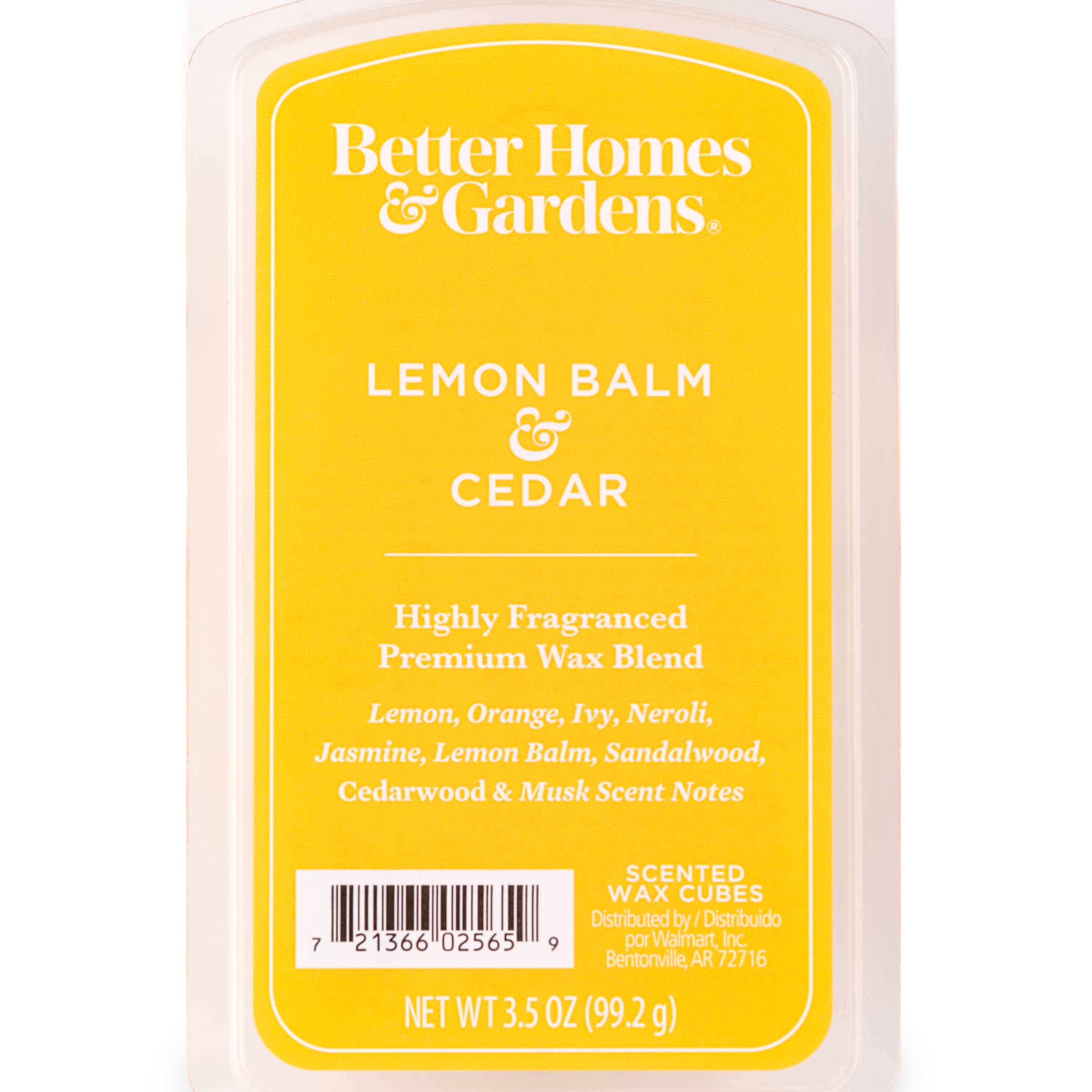 Better Homes & Gardens 3.5 oz Lemon Balm & Cedar Melts are highly fragranced and will fill your home with pleasing scent when warmed. Better Homes & Gardens Lemon Balm & Cedar fragrance offers a pleasing scent of lemon and orange citrus blended with ivy, neroli, hint of jasmine, sandalwood, cedarwood and musk. Simply break off a piece and place in your favorite warmer and enjoy. Wax melts allow you to fragrance your home without a flame and are easy to clean.