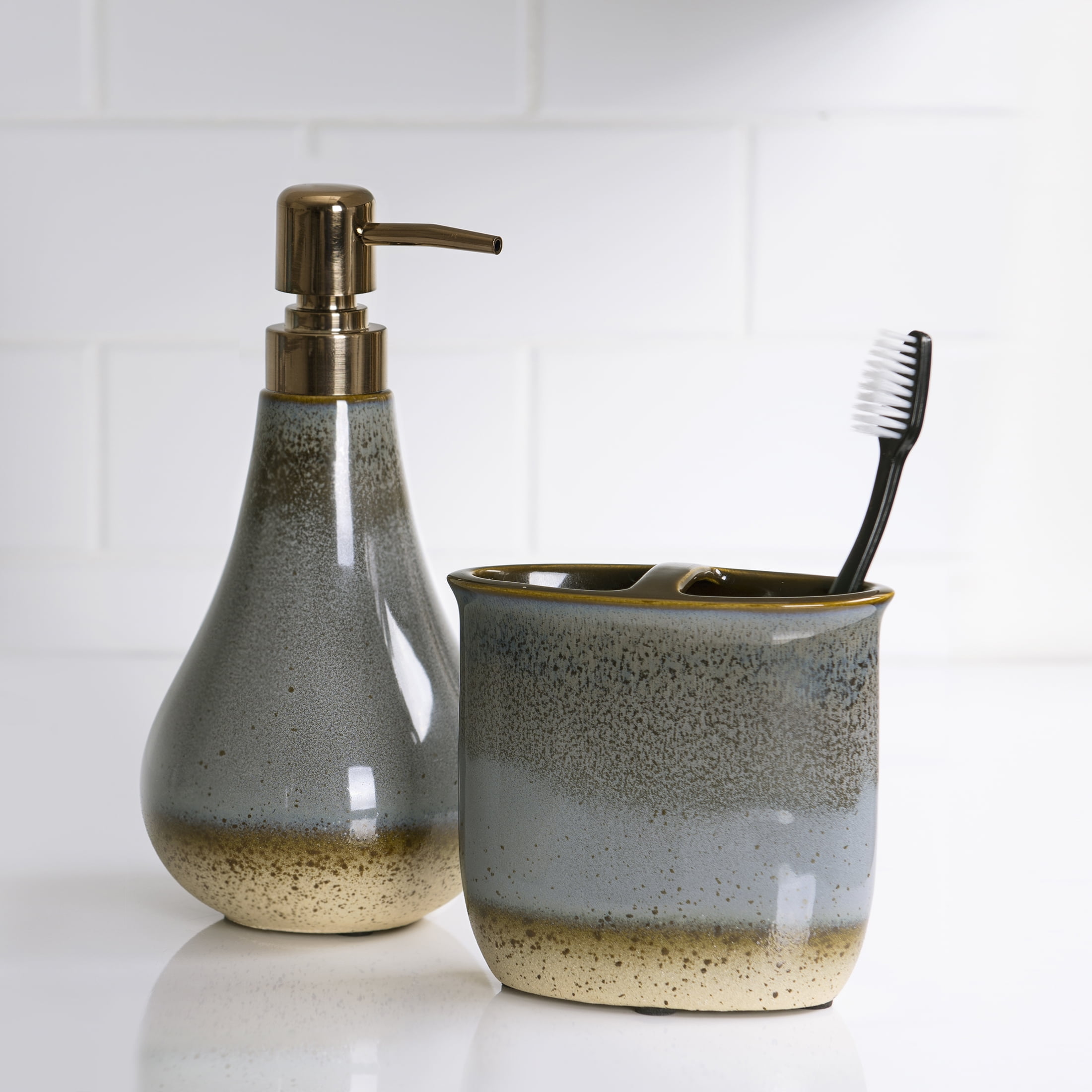 The organic natural feeling of the Better Homes & Gardens Reactive Ceramic Lotion Pump by Walmart Inc. will bring a rustic earthy feeling to your bathroom. Each pump in grey and natural earthtones is hand-crafted and unique. The reactive glaze finish creates variations in the color and visual styling making each piece feel like a one of a kind piece of art. The pump is made of 100% ceramic and is complemented with a chunky electroplated pump in a light copper finish. The easy-fill opening at the top allows you to conveniently store your favorite liquid hand soap or lotion. Use alone or coordinate with other matching pieces in the BH&G Reactive Ceramic Bath Accessory Collection. Hand wash.