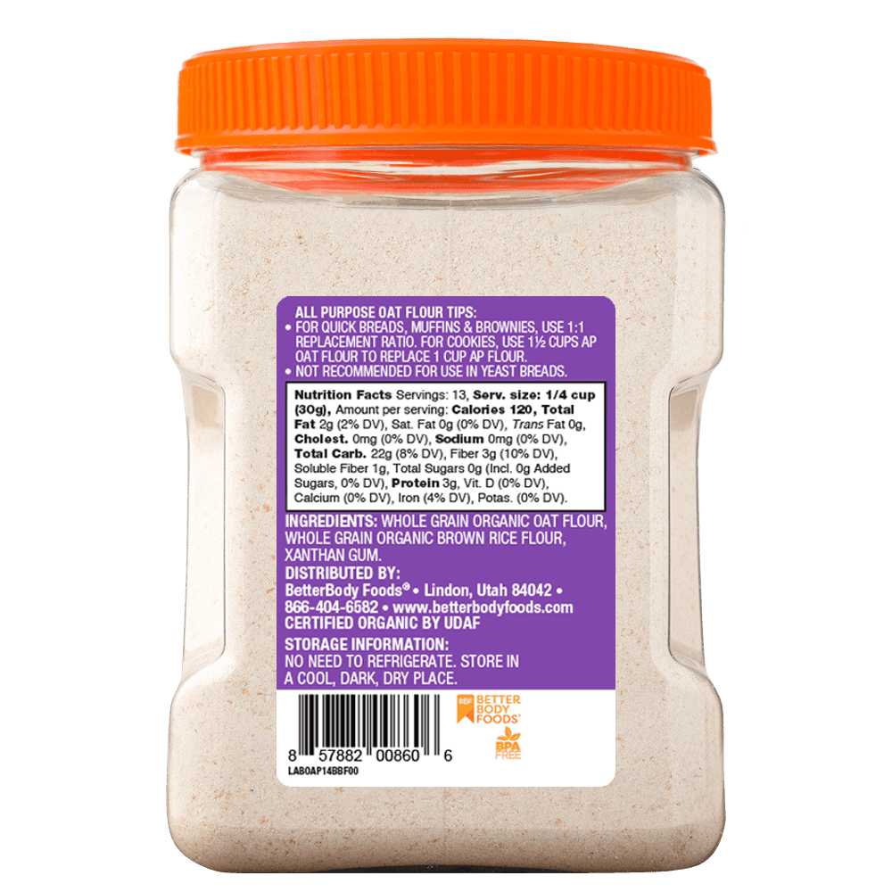 If you suffer from gluten intolerance or are simply in search of a healthier alternative to regular flour, BetterBody Food?s Organic Oat Flour is the perfect solution. Use this versatile baking flour for dredging, breading, and baking. With only 3 simple ingredients?whole-grain organic oat flour, whole-grain organic rice flour, and xanthan gum for baking?it has everything you need to make tasty treats.Betterbody Foods Org Oat Flour Blend 14oz