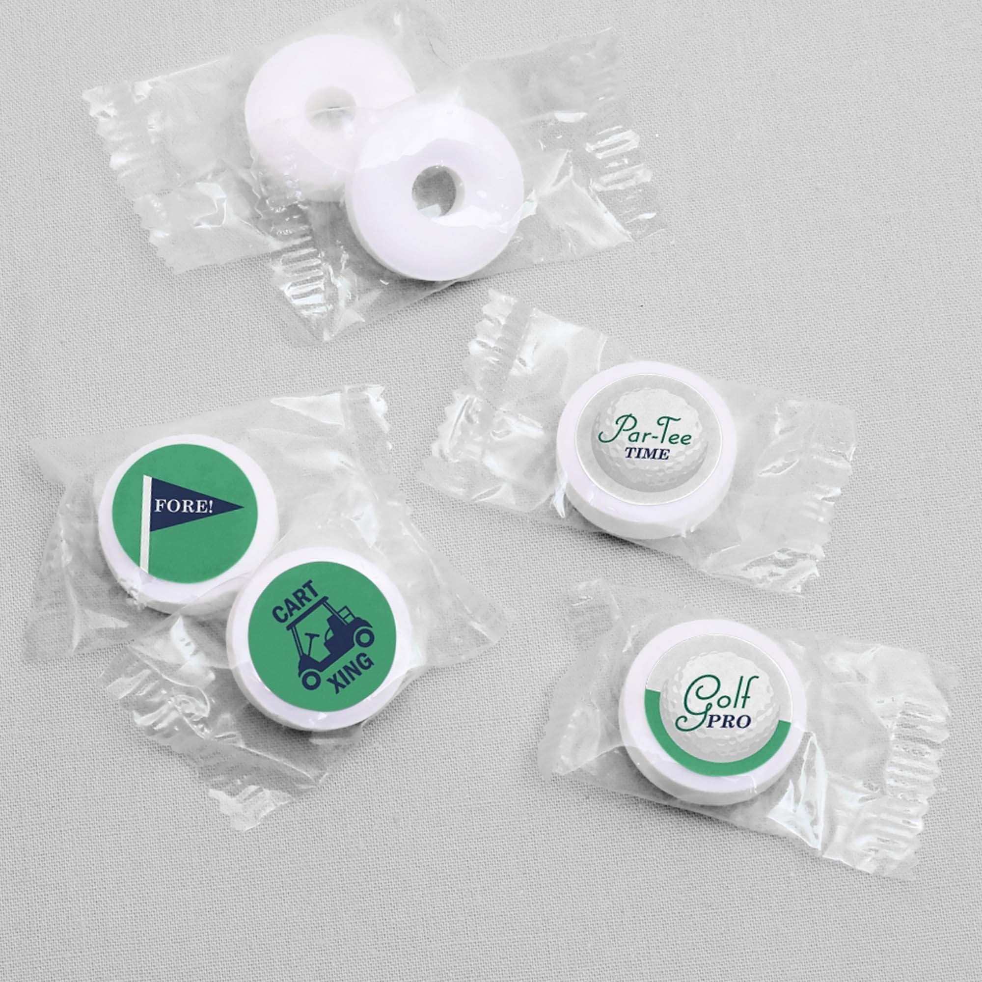 - Par-Tee Time Round Candy Favor Labels INCLUDES 108 candy stickers – perfect for styling adorable golf Birthday or Retirement Party. candy favors. Round candy labels will fit a variety of small candies with a flat, round bottom, like wrapped chocolate or peppermints. Candy not included.